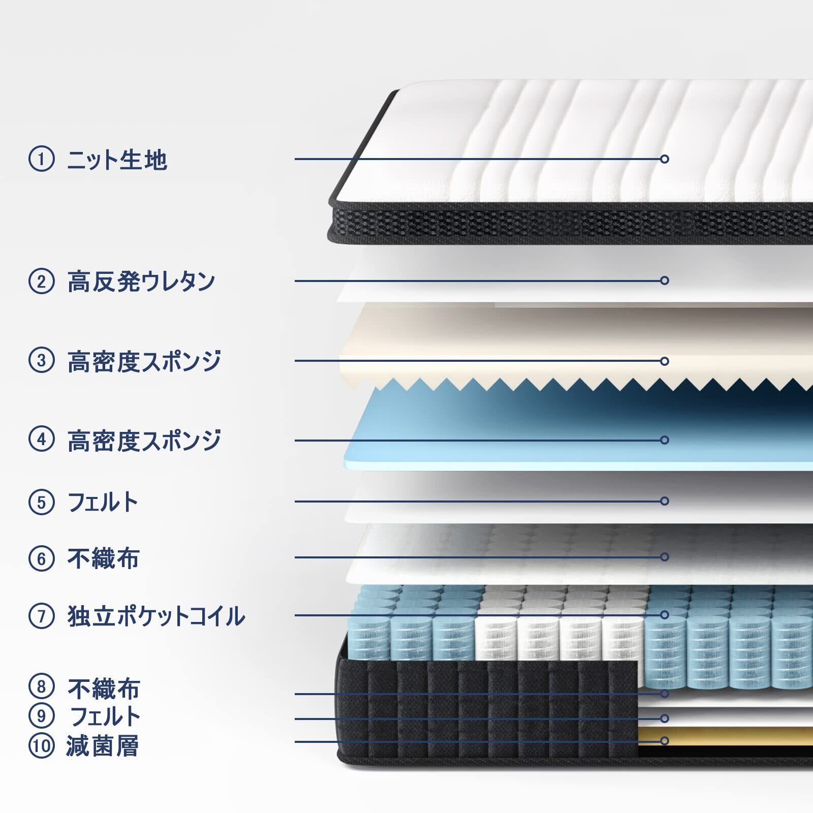 【こだわりの高級素材】 マットレスは、コイルとスポンジのバランスの取れた組み合わせ。並行して並ぶポケットコイルは、マットレス内部の空気循環がスムーズで、独立した構造よりも点負荷を吸収し、理想的な寝姿勢を保つことができます。良質な炭素鋼スプリングコイルは柔軟性が高く、異なる睡眠姿勢に合わせて調整して体の輪郭に適応し、一晩中楽な睡眠を楽しむことができます。