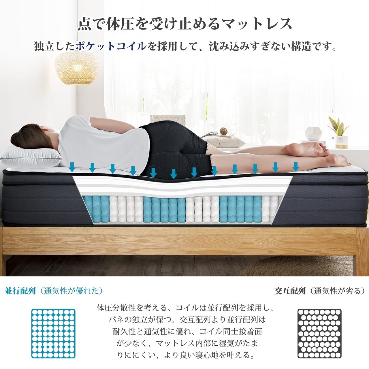 【独立したポケットコイル】マットレスは連続独立したポケットコイルを選べ、通気性が良いし、内部の空気循環させる効果することができます。独立した構造よりも点負荷を分散し、理想的な寝姿勢を保つことができます。2人寝る時も、寝返りなどの動きにも気にしないで、隣の睡眠を影響することになりません。良質な炭素鋼スプリングコイルは柔軟性が高く、異なる睡眠姿勢に合わせて調整して体の輪郭に適応し、一晩中楽な睡眠を楽しむことが実現します。