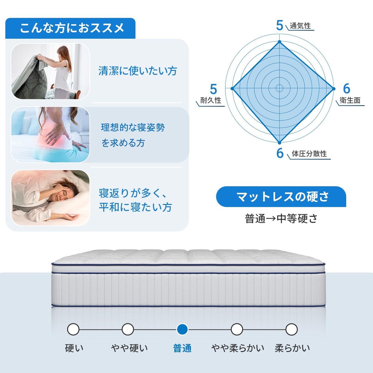 【高密度ウレタンで寝返りしやすい】健康的な睡眠をお宅のもたらすため、マットレス シングルの表面は伸縮性に富んでいるニット生地を採用しながら、約3㎝の高品質なウレタンを組み合わせます。指先が触れる瞬間、柔らかさが心地よく伝わり、まるで癒されたようです。キルティング仕様が高級感と寝心地をUPし、体を優しく受け止め、 質の高い睡眠をお届けします。さらに、スプリングの上には高密度スポンジクッションを重ねました。高密度ウレタンは高い復元率や弾力性を持つだけではなく、耐久性とサポート力にも優れます。だからこそ、体はしっかり支えられ、眠る時の安定感と寝返りのしやすさの両方が「ちょうどいい」状態に!