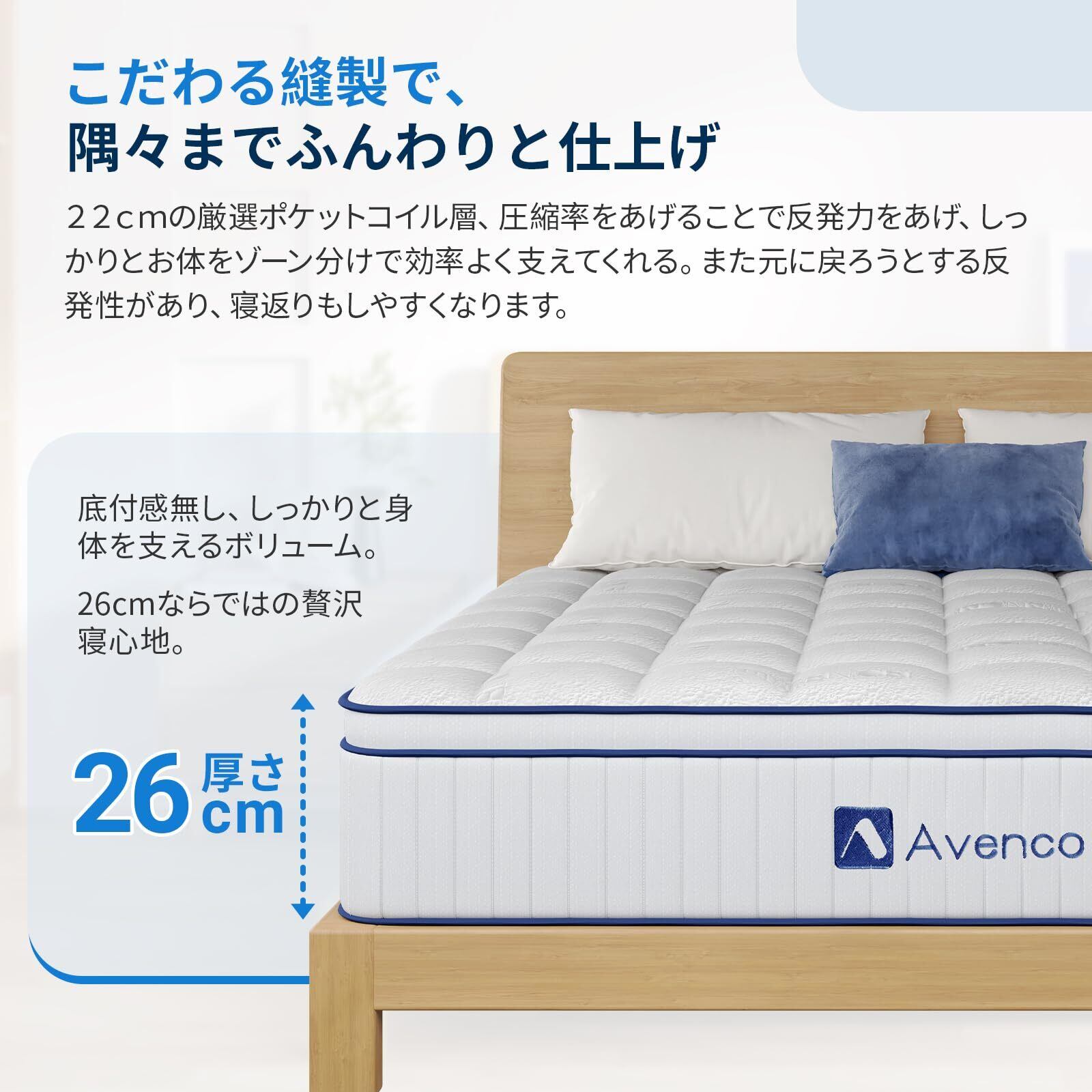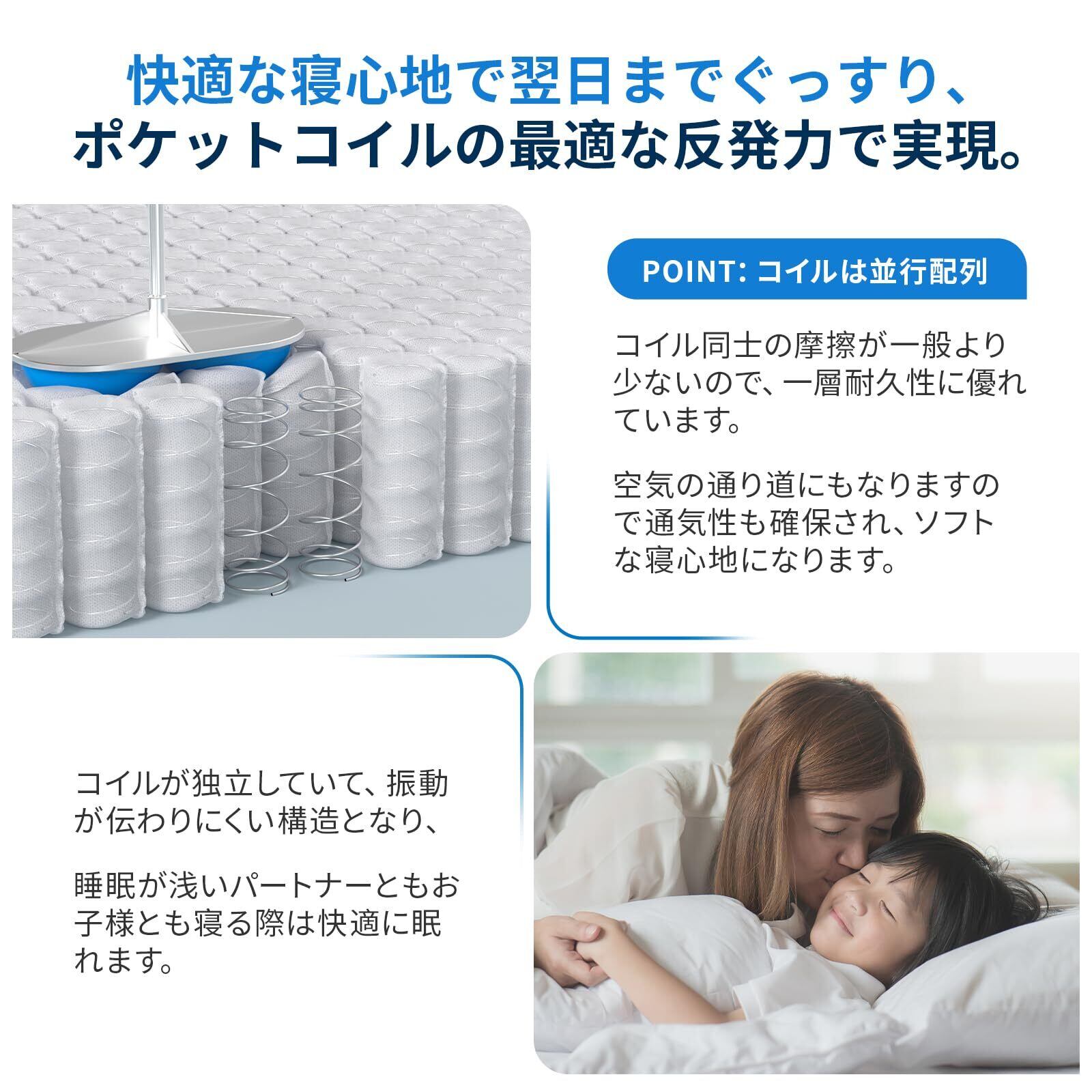 【お手頃の極厚26cm高反発マットレス】しっかり寝ているはずなのに疲れが取れないと感じていますか?起きたのに体のダルさが残ったり、肩や腰周りにお悩みのある方、睡眠環境を変えたほうがいいと思います。お悩みを解決するのは、この体圧分散性に優れたポケットコイルマットレスです。見えないところでもこだわり、どんなベッドフレームにも対応しやすい。極厚26㎝の厚みで底付き感なく、押した時の弾力性も他のマットレスより強く、隣で寝ている人への振動が伝わりにくいというメリットもございます。シンプルでお手頃の価格をかけ、シングル、セミダブル、ダブルとクイーン四つのサイズを用意しています。コスパが高くてお一人暮らしやご家族の使用まで最適で、ぜひお見逃しないでください。