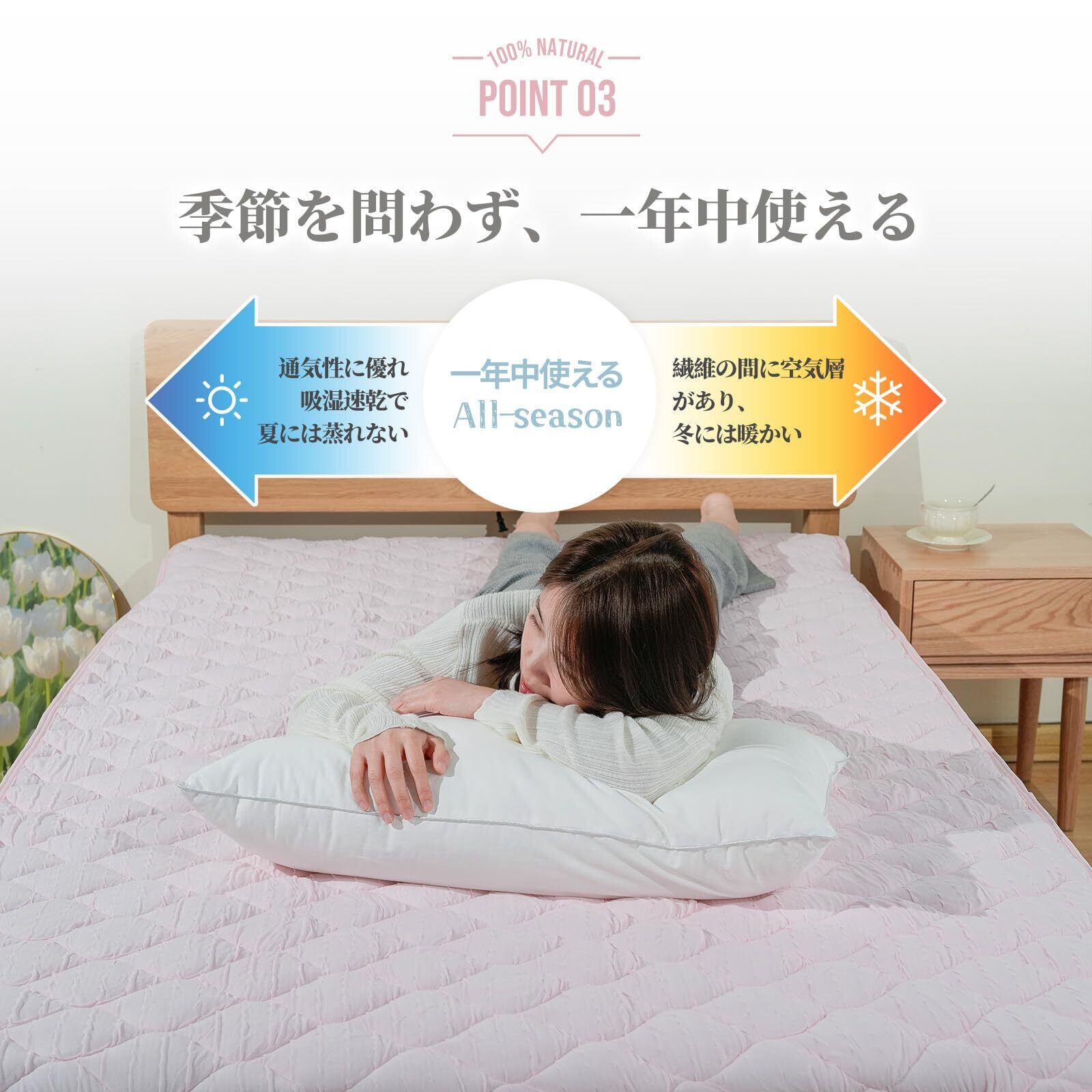 【オールシーズン快適】クシュフワのレーヨン100%敷パッドは通気性と吸放湿性に優れ、肌離れがよく湿気や汗をしっかり吸収・発散し、真夏も蒸れなく、静電気に強く、乾燥の春秋冬もバチバチしなく、一年中使える敷パッドです。