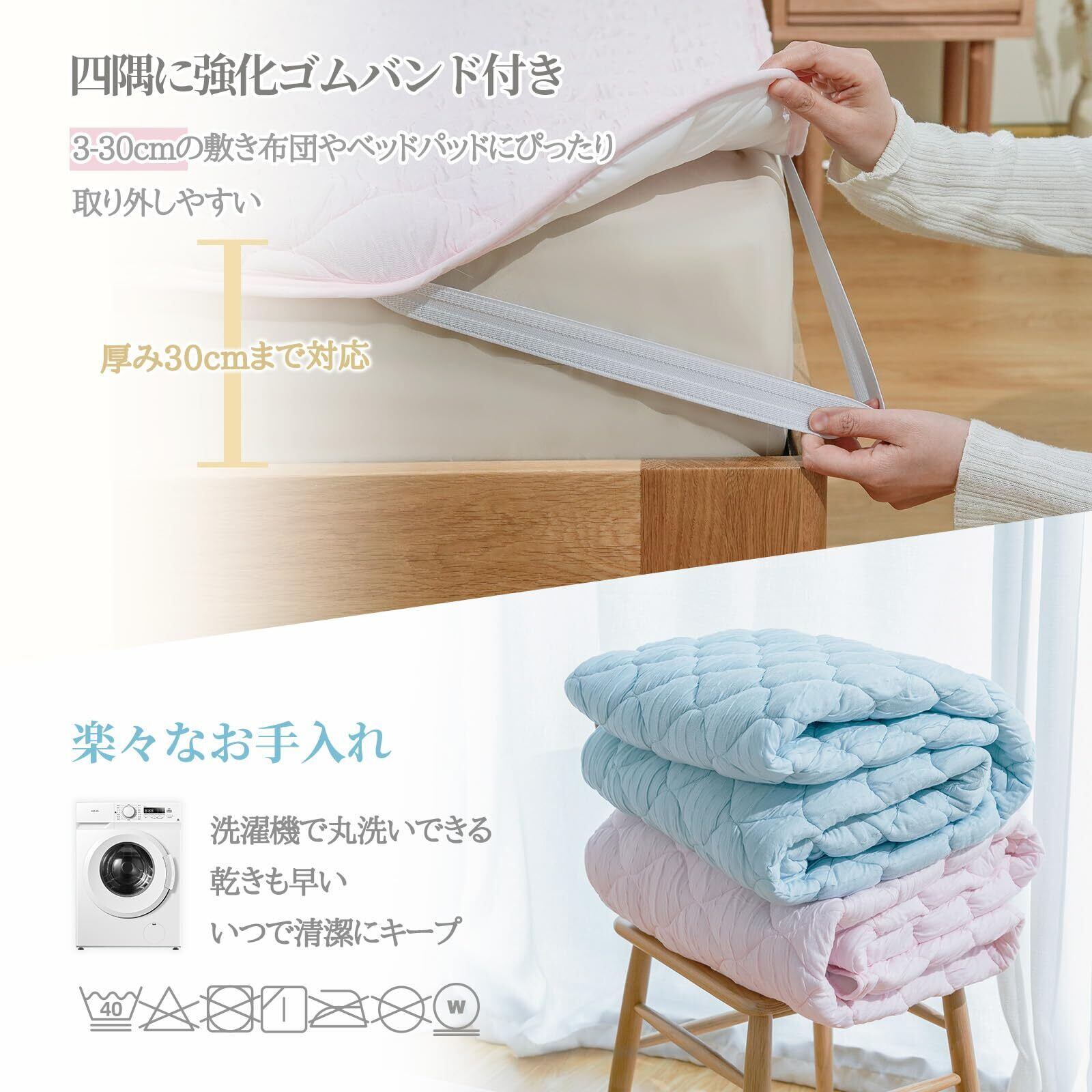 【耐久性のあるベッドパッド】細かなキルティングでボリューム感が出て、中わたもよれにくく、しっかりした2本針ヘムもほつれにくく、型崩れしないです。ずれないように丈夫で伸びにくい強化ゴムバンドを使って、長持ちできます。