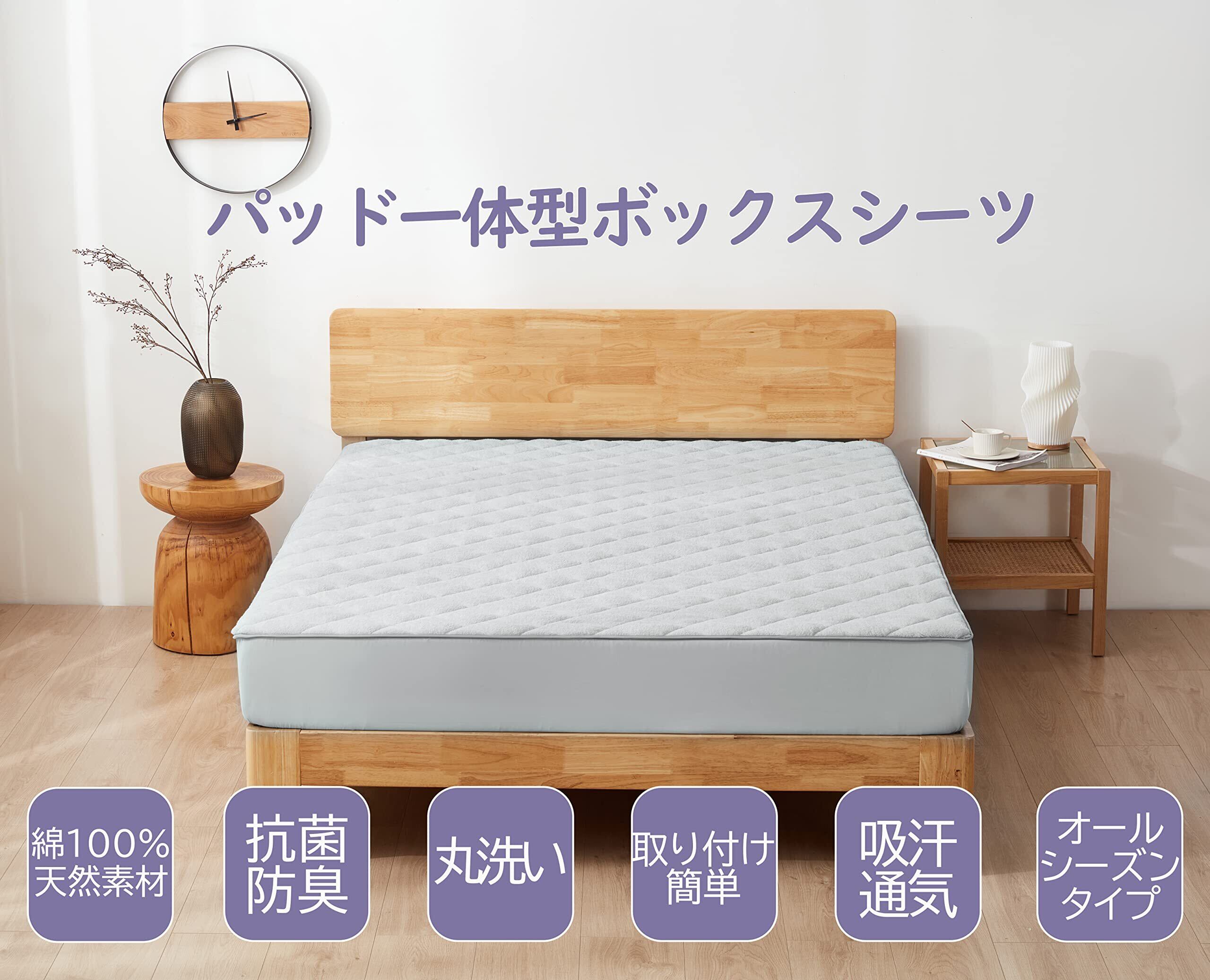【ボックスシーツ+敷きパッド 一体型】:ほどよい厚みの中綿を入れ、ふんわり心地よい寝心地を実現しました。一体型なので敷パッドの取り付け用ゴムが表に出ることもなく見た目もキレイ!全周フィットゴム付きで取り付けも簡単です。ベッド用、マットレス用、敷ふとんなどにも使えます。