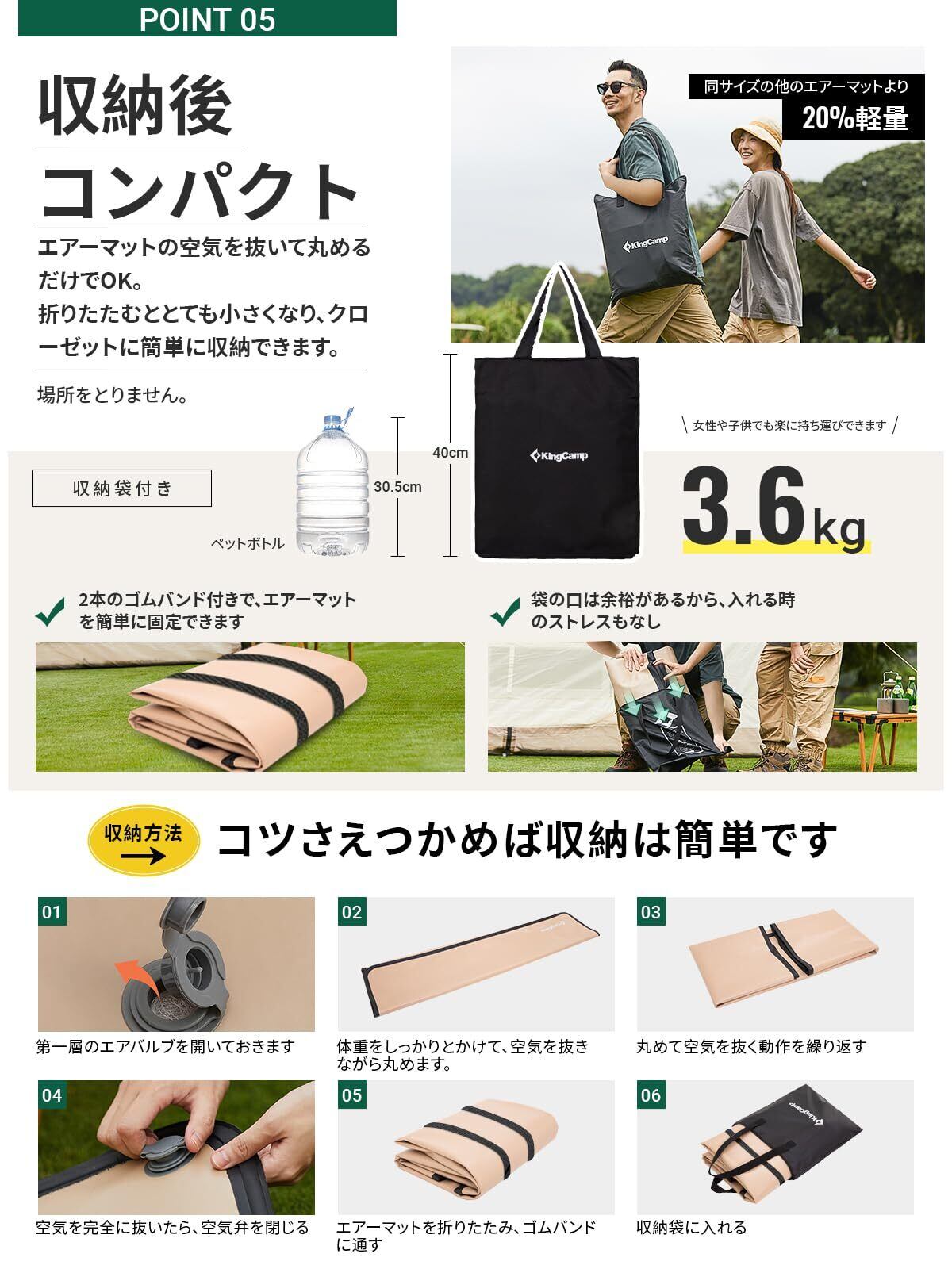 【商品仕様】展開サイズ:200x140x5cm 収納サイズ:40*33*9cm 重量:3.6kg 付属品:マット本体*1、ポンプバッグ*1、収納バッグ*1、収納バンド*2