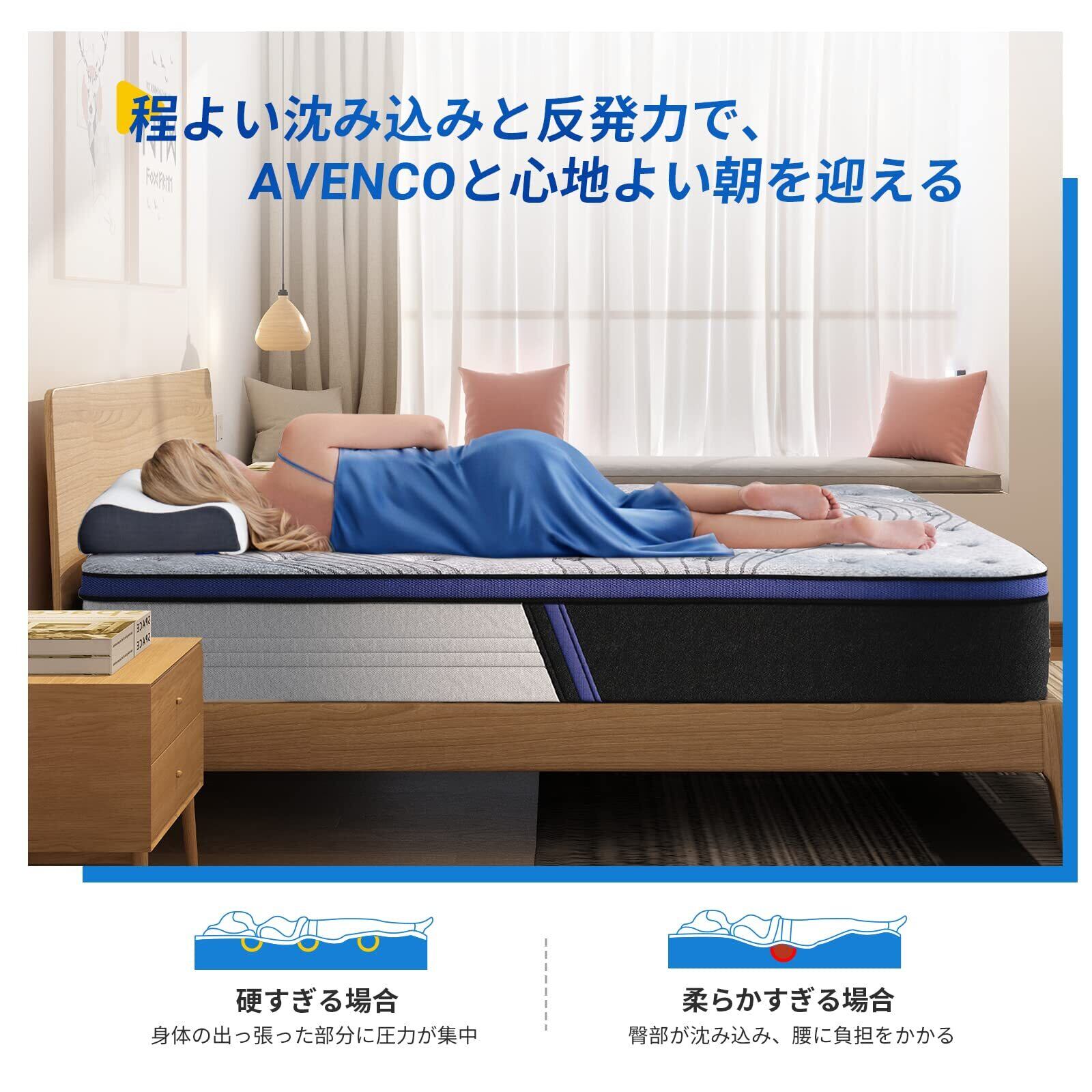 「普通~やや柔らかいのマットレス」Avenco ポケットコイル セミダブルマットレスの従来品より、柔らかめに作ったマットレス寝具。たっぷり詰めたウレタン素材としっかり身体ラインを支えるポケットコイルで ①フィット感・②体圧分散性・③保湿性 などの面に誇りを持ち、適度な反発力と体圧分散性を合わせ持ち、今までにない寝返りの打ちやすさと寝やすさを与える!良好な寝姿勢を保つavencoマットレス。