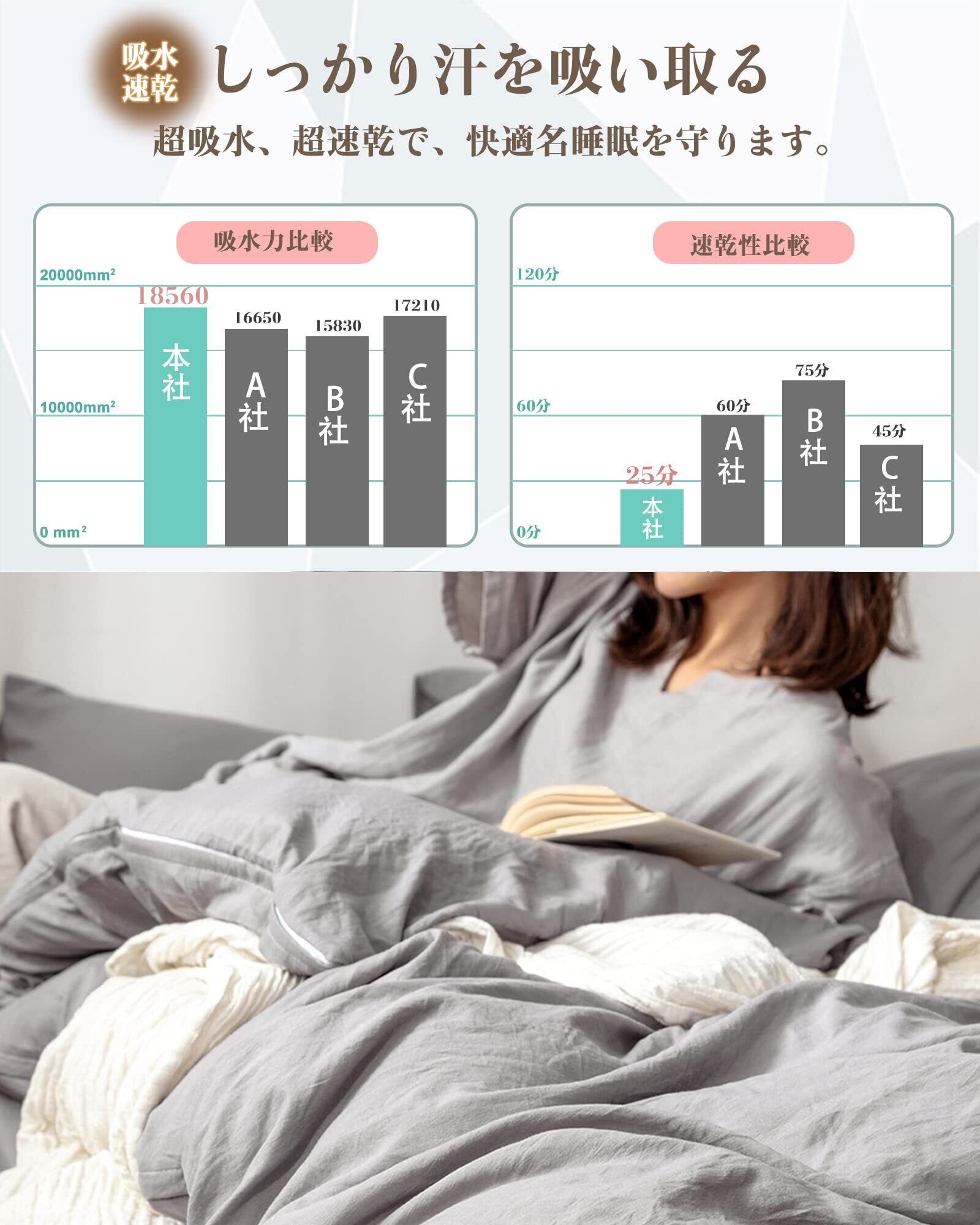 【通気性抜群&オールシーズン使える】水洗い加工で普通のベッドシーツと比べ、優れた吸湿性と通気性で、汗でもベタつかないサラサラ感を保ちます。ムレにくく、春夏秋はサラサラ、冬は暖かくて1年中快適にお休みいただけます。 丁寧に織り上げることにより、耐久性にも優れたしっかりとした生地に仕上がりました。