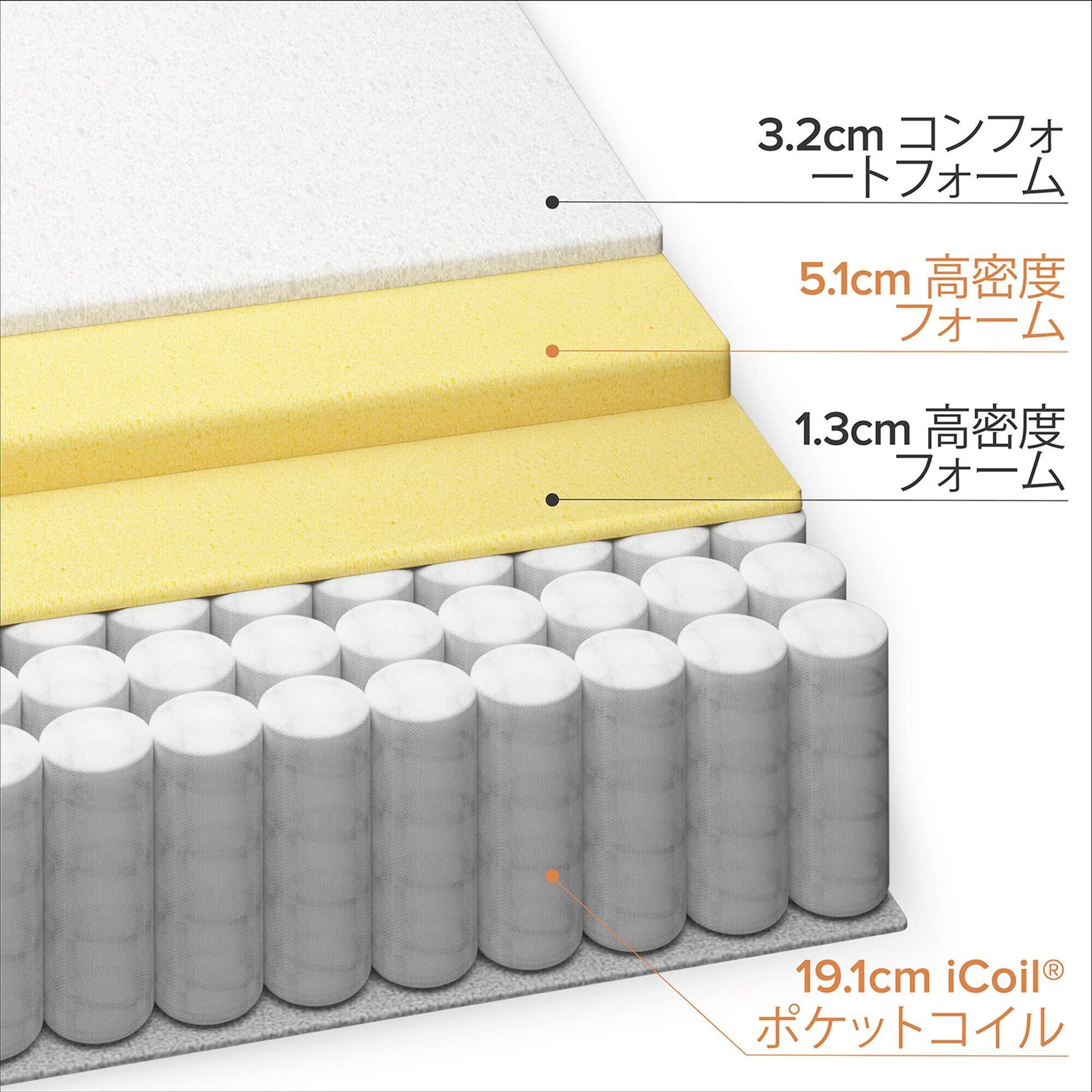 【独立コイルシステム】 ZINUS独自の独立コイルシステム(ポケットコイル)は、通気性に優れた並行配列で、シングルサイズには450個、セミダブルには570個、ダブルには660個のコイルを使用しています。コイルが適度なかたさで体を支え、理想の寝姿勢を実現します。