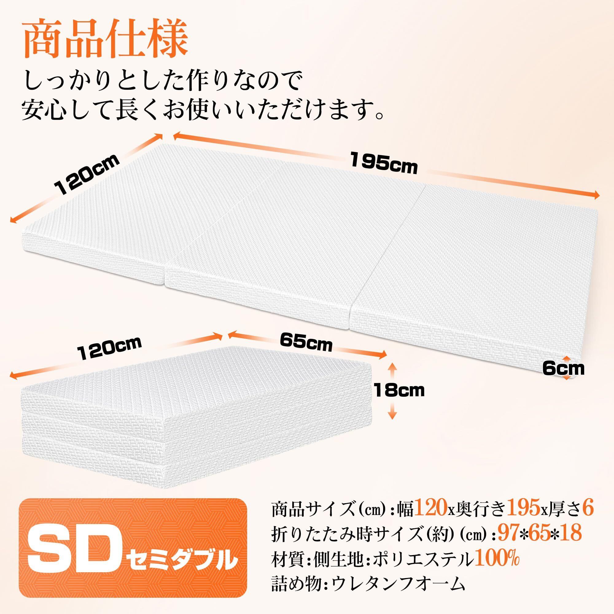 【商品情報】サイズ:幅120x長さ195x厚み6cm(セミダブル);側生地:ポリエステル100% 中材:高反発ウレタンフォーム(密度30D、180N);【梱包サイズ】幅26×奥行26×高さ68;【重量】約6.7kg