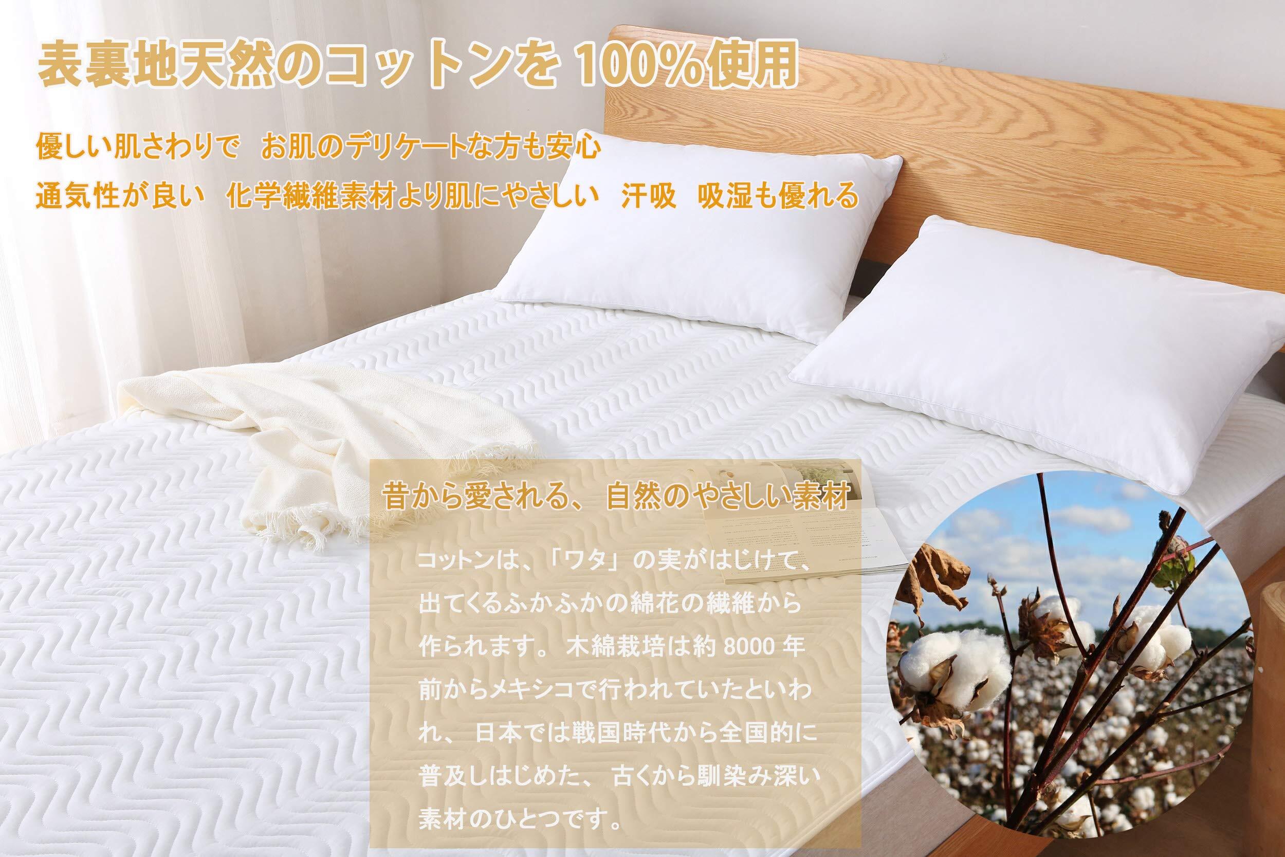 【表裏地綿100%!】お肌に喜びやさしい心地。綿は自然の恵みの天然素材。化学繊維にアレルギーの出る方も安心、地球環境にも私達にもとってもやさしい繊維です。「オールシーズン向け」表裏地の天然素材綿100%が特徴(リバーシブルタイプ)、耐久性も高いベッドパッドは、汗の季節も冷える季節もオールシーズン活躍しております。