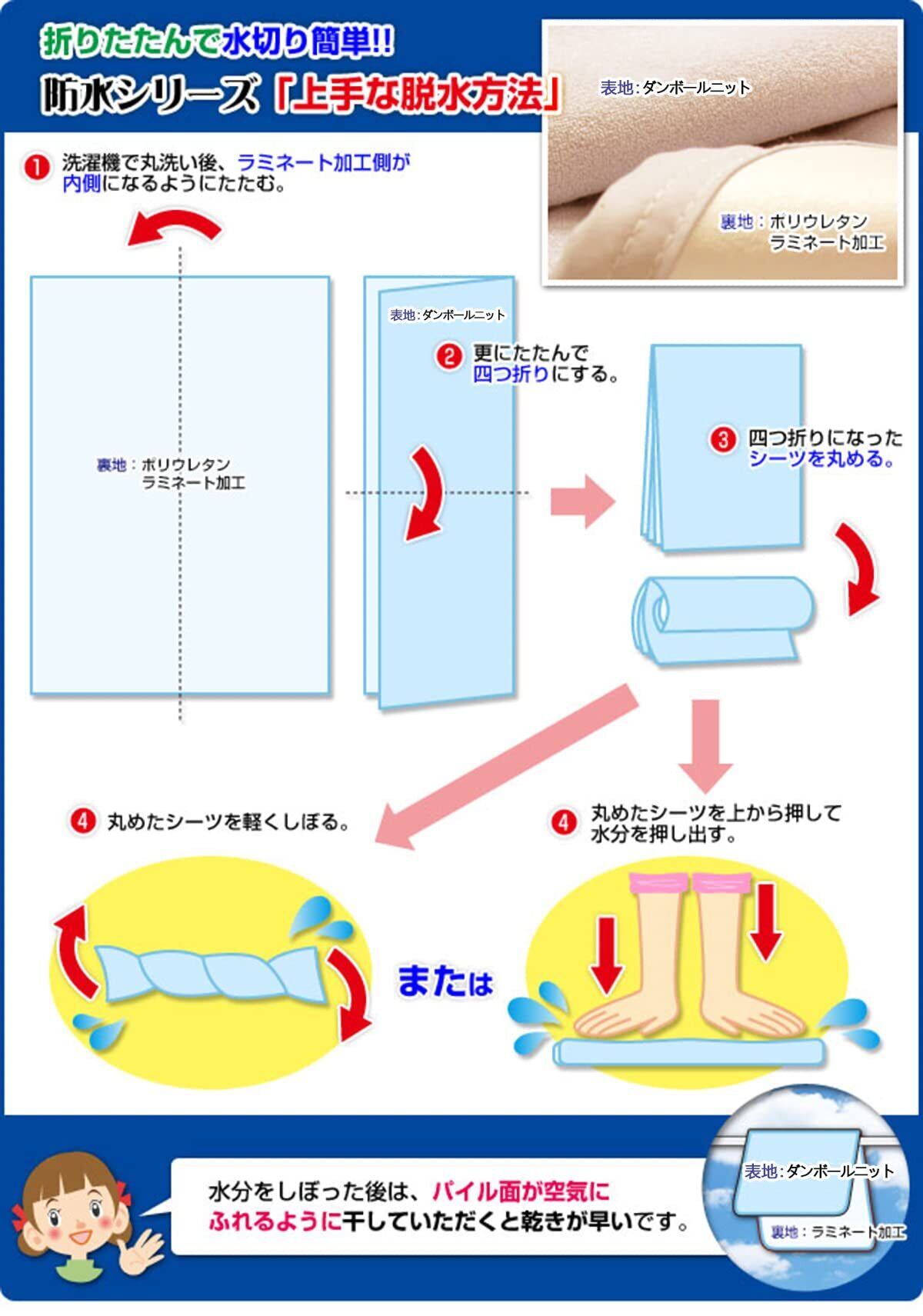 【丸洗いOK】ご自宅の洗濯機で丸洗い可能、いつでも清潔に使えます。おねしょの後処理や衛生面でも大助かります。水流を「弱」にし「洗濯ネット」をご使用ください。防水素材なので、シーツは完全に脱水できません。※乾燥機は使用しないでください。 ※電気毛布など熱源のあるものとの併用不可です。