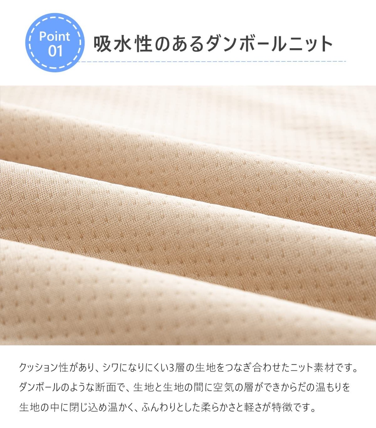 【表面はダンボールニットキルト】クッション性があり、シワになりにくい3層の生地をつなぎ合わせたニット素材です。ダンボールのような断面で、生地と生地の間に空気の層ができからだの温もりを生地の中に閉じ込め温かく、ふんわりとした柔らかさと軽さが特徴です。軽くて薄いので上げ下げや収納も便利。