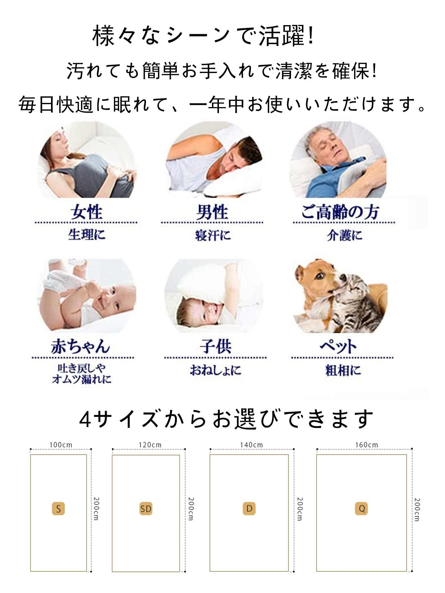 ★【商品仕様~おすすめ】80x200x30cm、 100x200x30cm、120x200x30cm、140x200x30cm、160x200x30cm 。マチを30cm取っていますので厚さ5~28cmのマットレス等対応可能です。普通のベッド、厚さほどのベッドマットレス、薄めの敷き布団にもいろいろ使えます!和式・洋式兼用!介護用やおねしょはもちろん、敷布団やマットレスへの浸水、汚れなどをしっかり防いでくれます。子供との添い寝やペットと一緒に寝る時に大活躍。