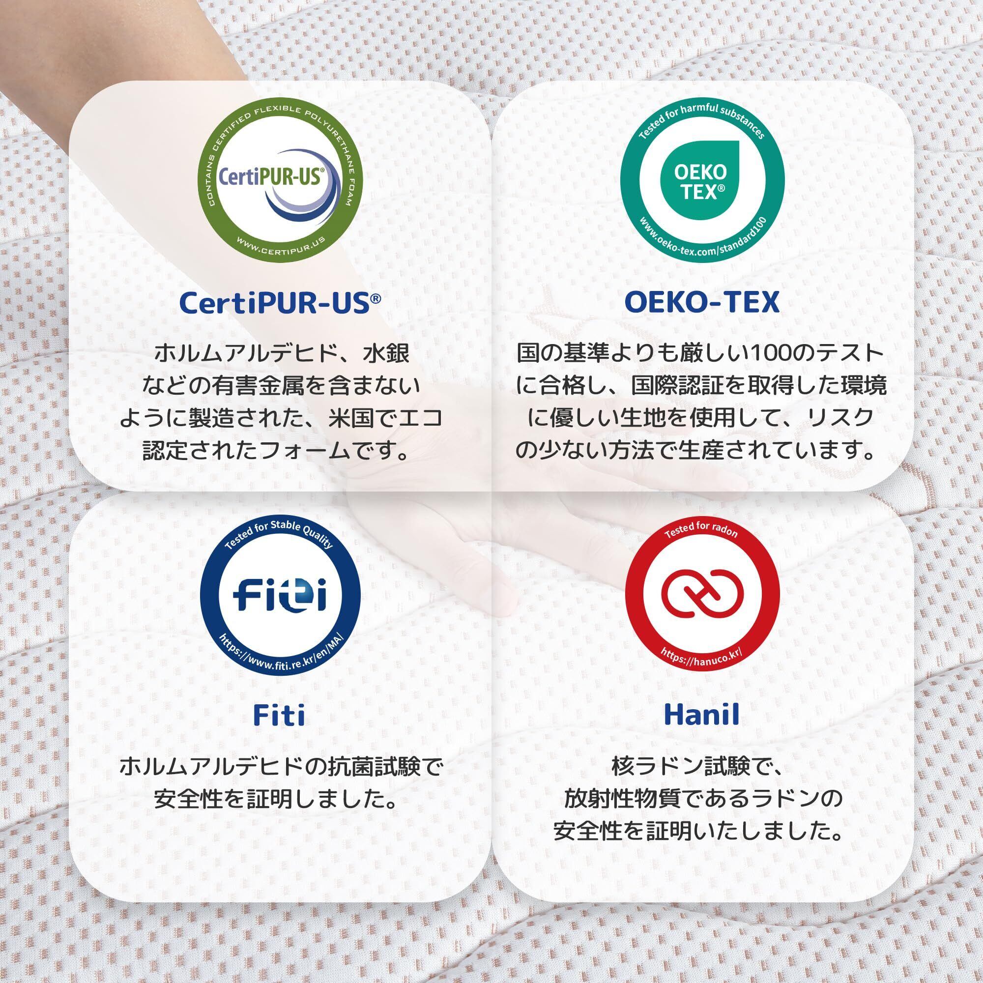 - CertiPUR-US: 屋内排出・製品性能・物理的耐久性・環境責任に関するポリウレタンフォームの認証。