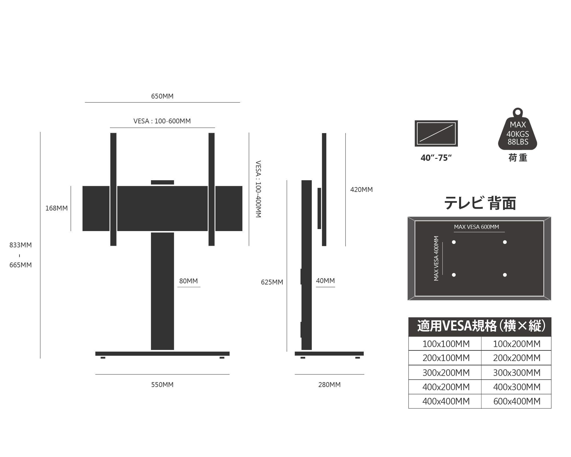 【VESA規格対応】最大適合VESA:600mm*400mm;最小適合VESA:100mm*100mm;耐荷重:ラック40kg ;40"-75"までのテレビに推奨