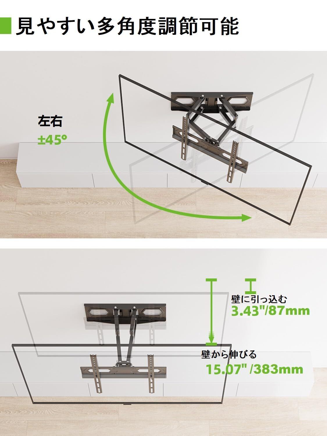 【角度調整可能】アームの左右角度調節は3箇所があります。1. 壁側の取付け部は左右各45度で角度が調整できます。2. アームとアームの接合部は壁面から87~383mmまで調整可能です。3. テレビ取付け金具部は左右各4度、上向き5度、下向き15度で角度が調整できます。るので、引き出して必要な位置に画面を移動できます。