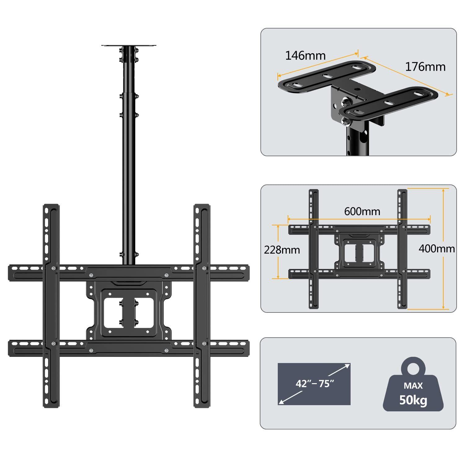 JXMTSPW テレビ天吊り金具 42-75インチ 上下左右角度調節 上下伸縮可能 tv吊り下げ金具 耐荷重50KG 軽めの天井取付式 適用会議室/地下鉄/スーパー/ジム モニター テレビ 天井吊り金具 簡単な取り付け