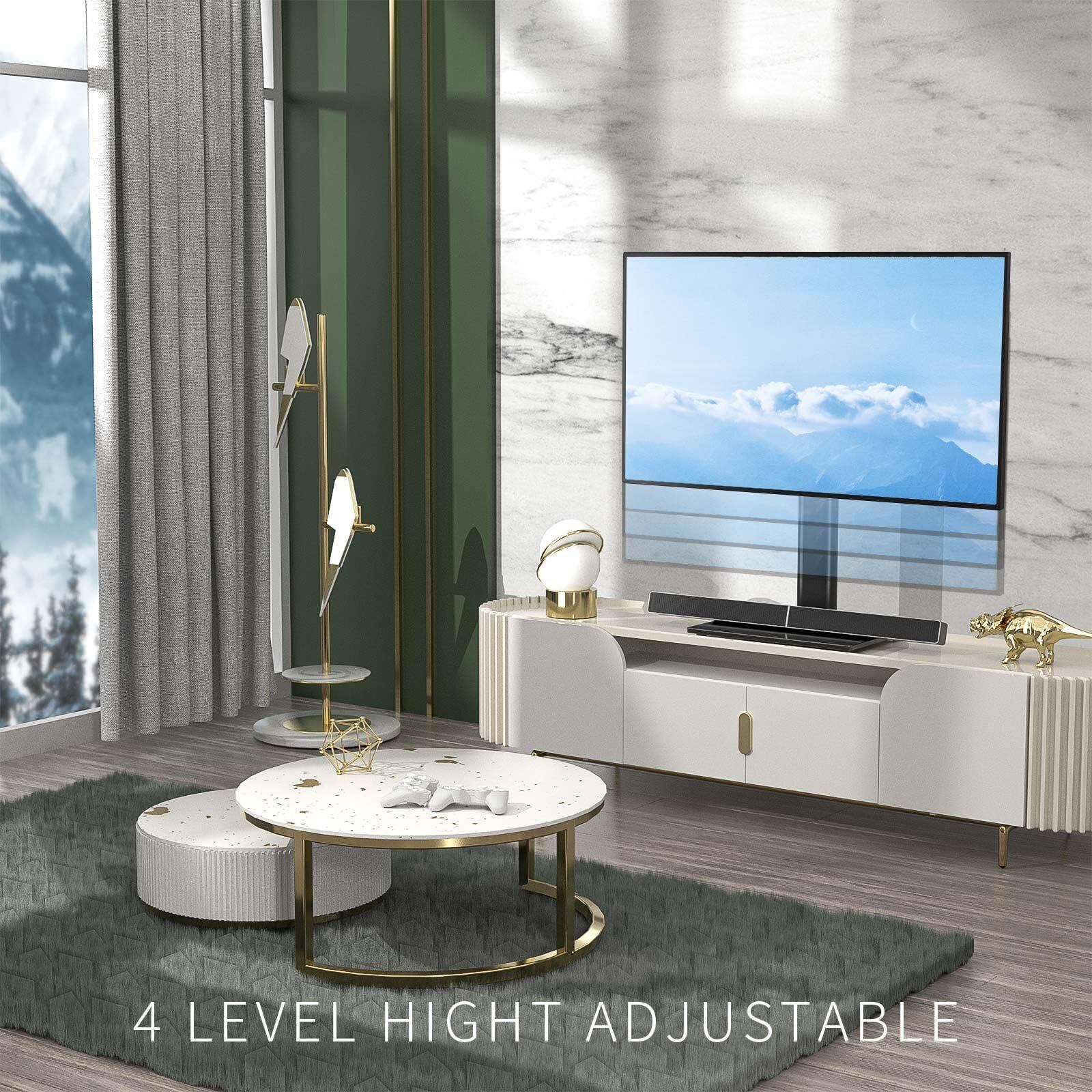 高さ調節可能な機能的なテレビマウント ☞ ユニバーサルテレビスタンドは4段階の高さ調整が可能で、ブラケットパネルをスチールバーに掛けて安全ネジを固定できるため、非常に安定性があります。