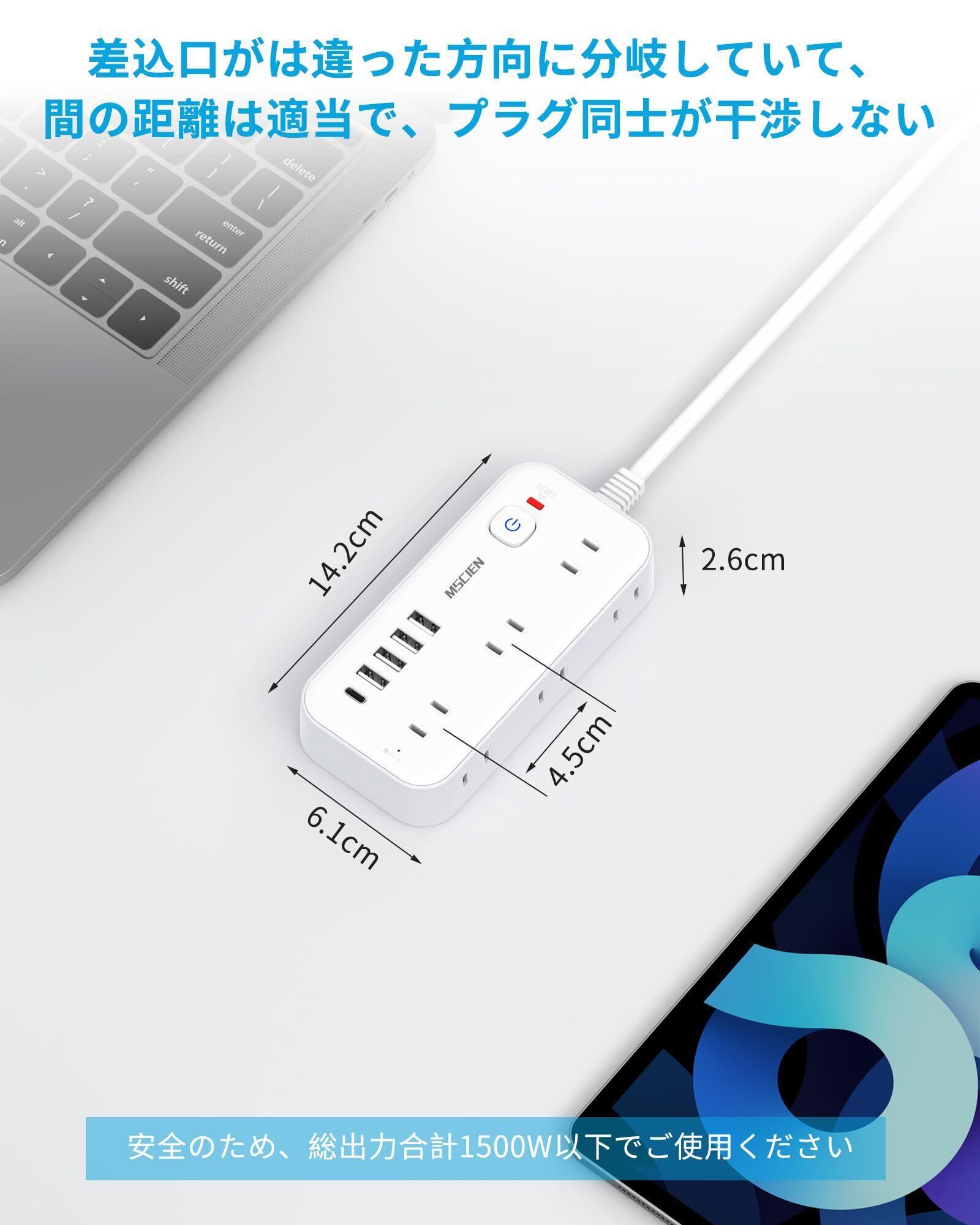 延長コード 3m 電源タップ usb付き コンセントタップ タコ足配線 Mscien 6個AC口 4usb-a 1usb-c 電源タップ usb スイッチ付き 雷ガード テーブルタップ 電源コード 蛸足コンセント タップ コンセント 分岐 たこあし oaタップ マルチタップ おしゃれ 電源 タップ 横差し 延長 コード 壁掛け/卓上に (3M)
