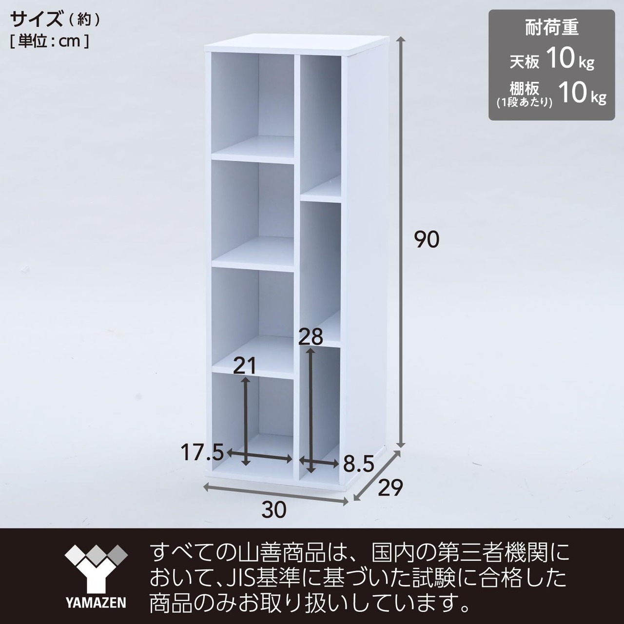 ●本体サイズ : 幅30×奥行29×高さ90cm●全体耐荷重 : 60kg(天板耐荷重 : 10kg、棚板耐荷重1枚あたり : 10kg)●構造部材 : プリント紙化粧パーティクルボード、プリント紙化粧繊維板●東証プライム(株)山善で扱うすべての山善商品は、自社もしくは第三者機関において、JIS規格に基づいた品質試験を行っております。