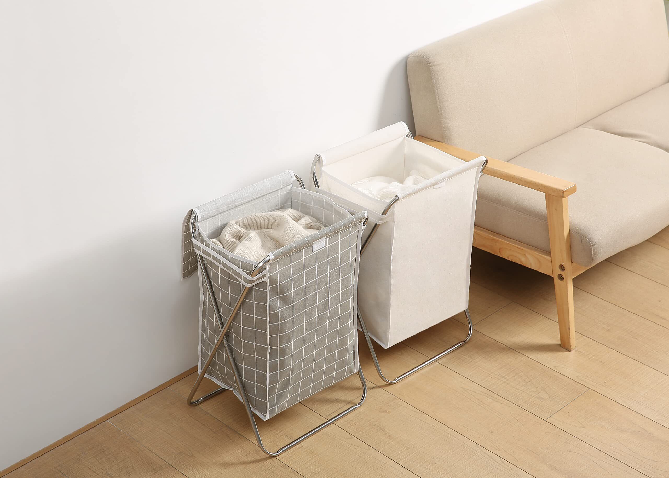 【折りたためる&シンプル】ランドリーバスケットの底面は直接床に着かないのでホコリや汚れが付きにくくなっています。X字型のデザインで開閉機能付き、使わないときは折り畳んで洗濯機の隙間に収納可能です。インテリアこだわり派にもぴったりの、シンプルかつ生活感のないデザインが魅力のランドリーかご。