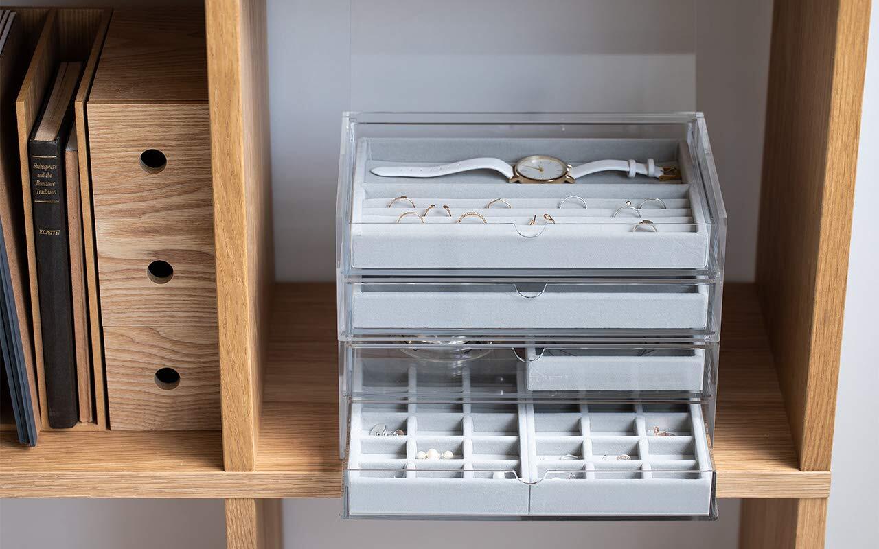 2段まで積み重ねができる、「見せる」収納に適した透明アクリルケースです。上がフタ付き、下が引出タイプで、下段を引き出すと、すべての収納アイテムを一覧することができます。中に入れて使えるベロア内箱仕切は、格子型、縦型など、用途に合わせた組み合わせが可能です。