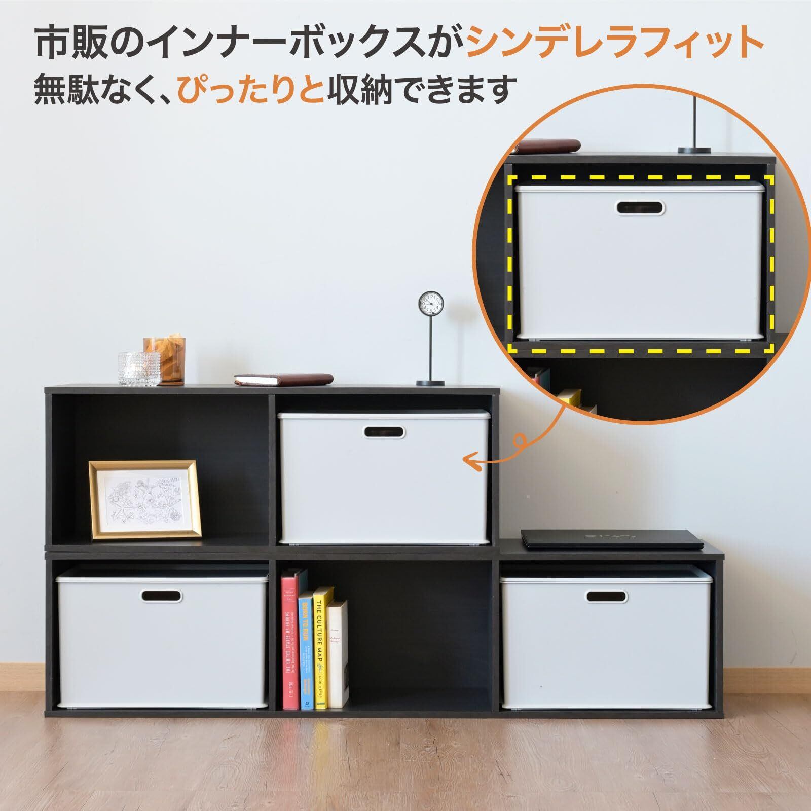 【収納用ケースが入るサイズ感】横置きで使用するとどこでも収納ボックスや市販のインナーボックスがぴったり入るサイズ感です。無駄なくすっきり収納できます。