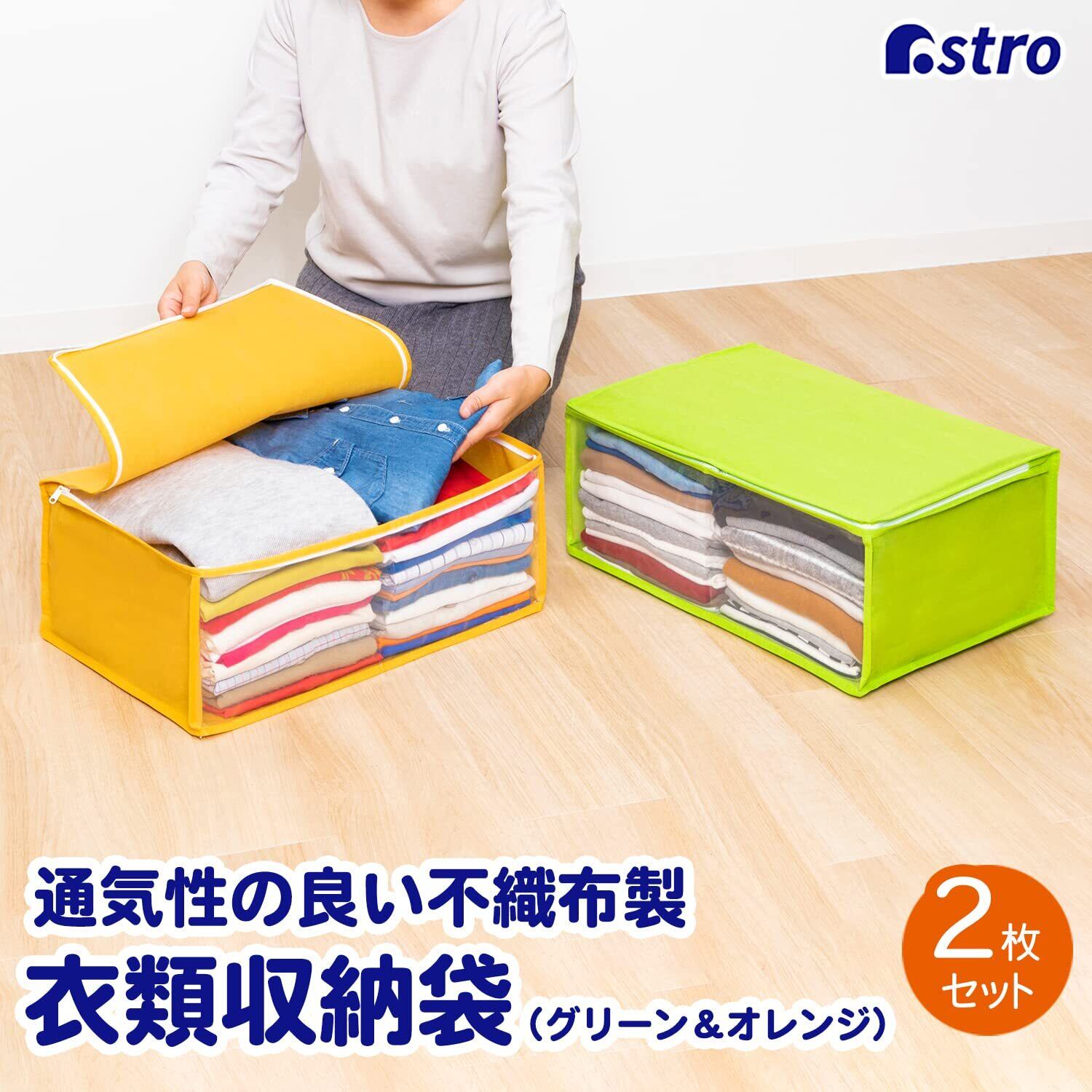アストロ 収納ケース 衣類用 オレンジ イエローグリーン 2枚組 不織布 収納袋 衣装ケース 収納ボックス ソフトケース 折りたたみ 透明窓付き 619-31