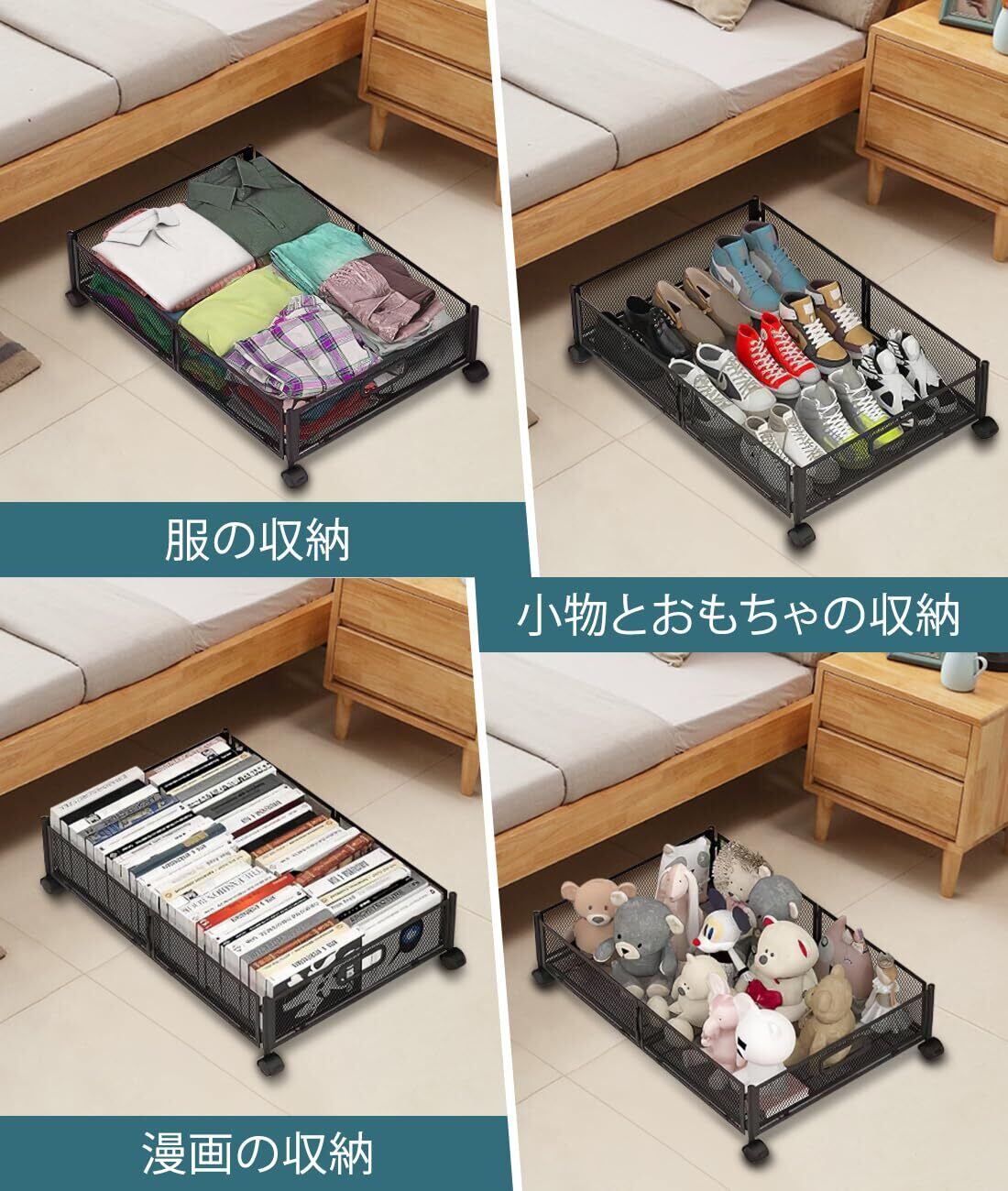 【幅広い用途】ベッド下収納引き出しは、季節のベッド下衣類収納、ベッド下靴収納、寝具収納などに最適です。ベッド下のスペースを有効活用して省スペースに。