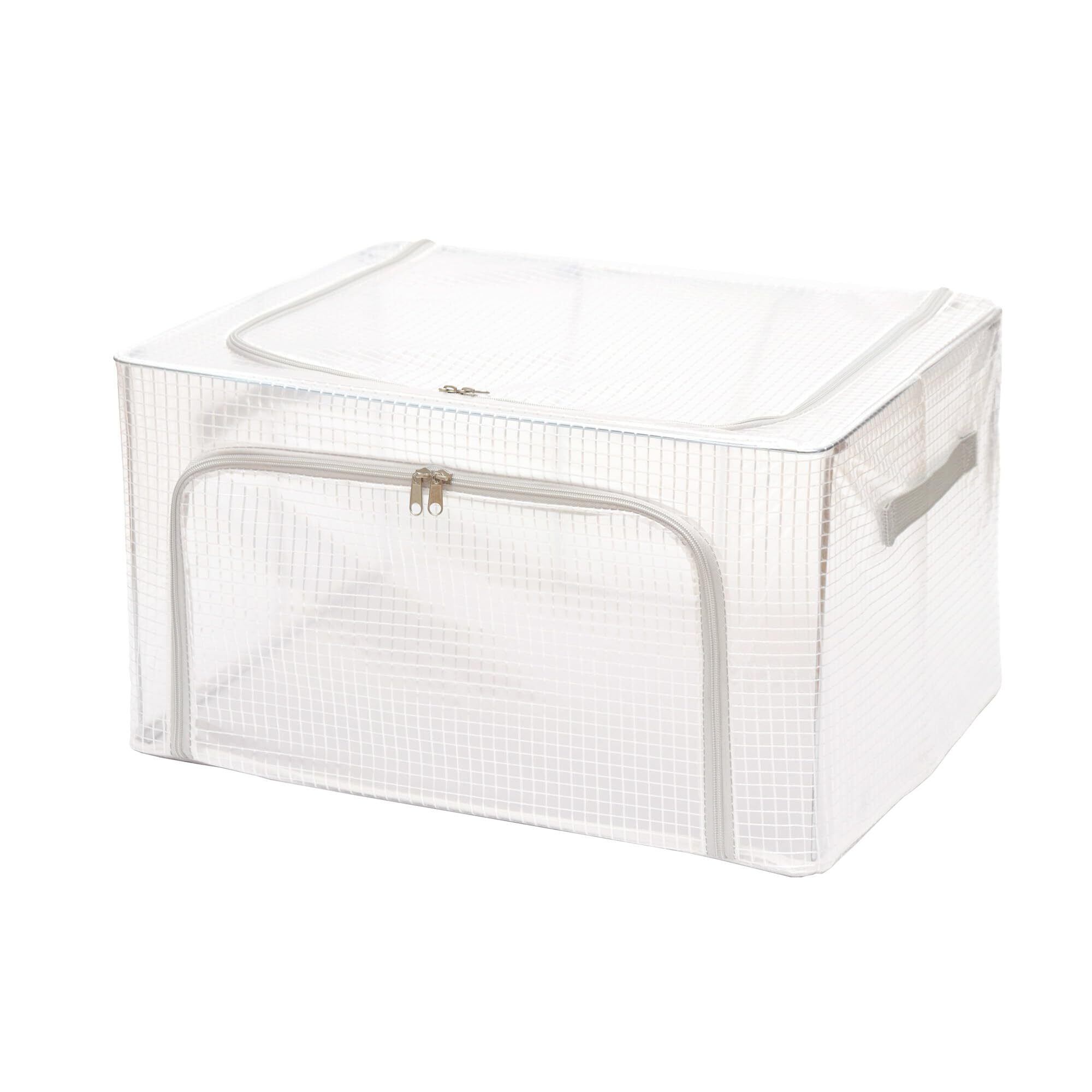 積み重ねたまま出し入れOK!スチール芯材入りでしっかり自立するクリアボックス。