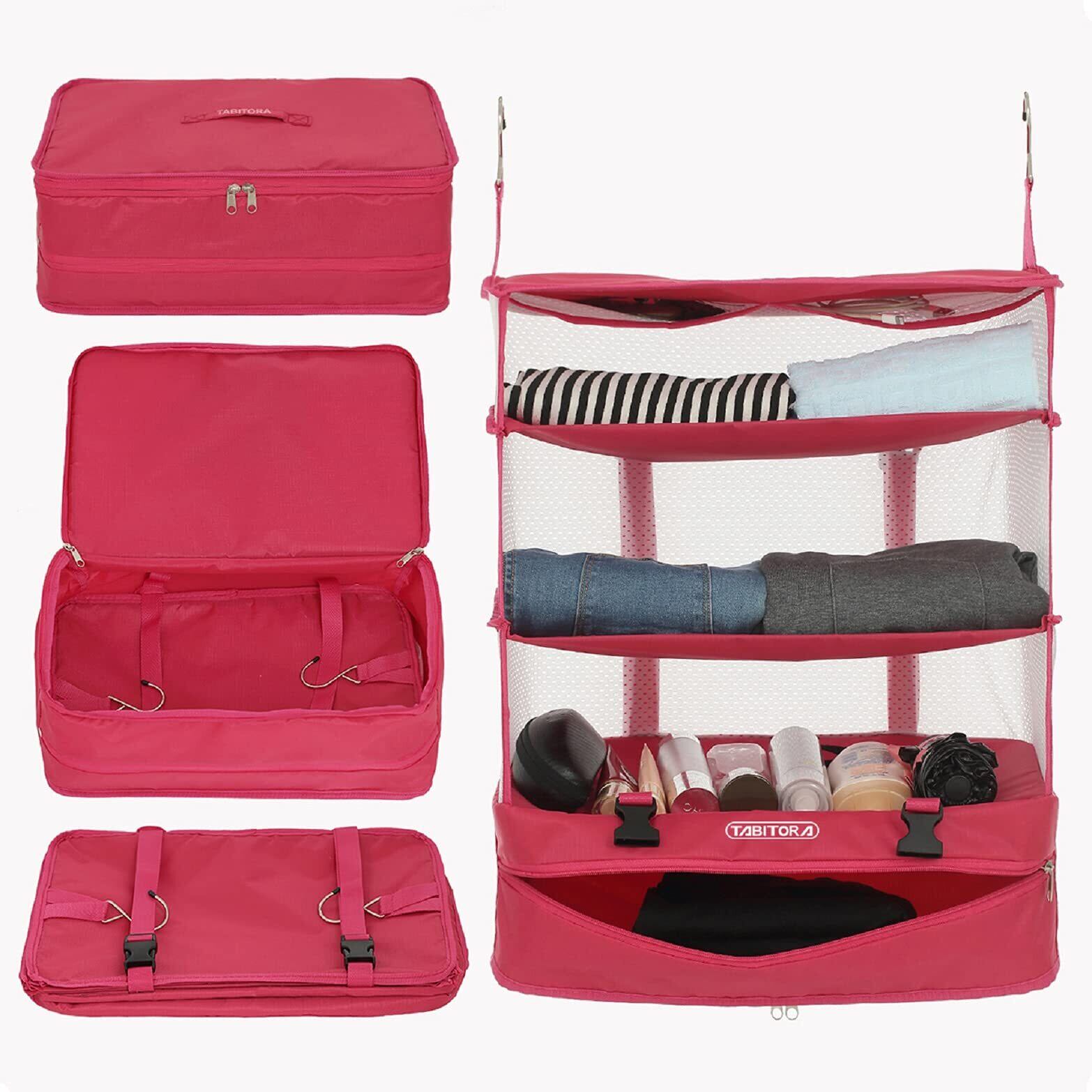 TABITORA(タビトラ) クローゼット吊り下げ収納 インナーバッグ 衣類ラック 収納 旅行 出張 クローゼット 収納ボックス 吊り下げ 省スペース 大容量 衣装ケース 4段 取付簡単 折り畳み式 ローズ XL