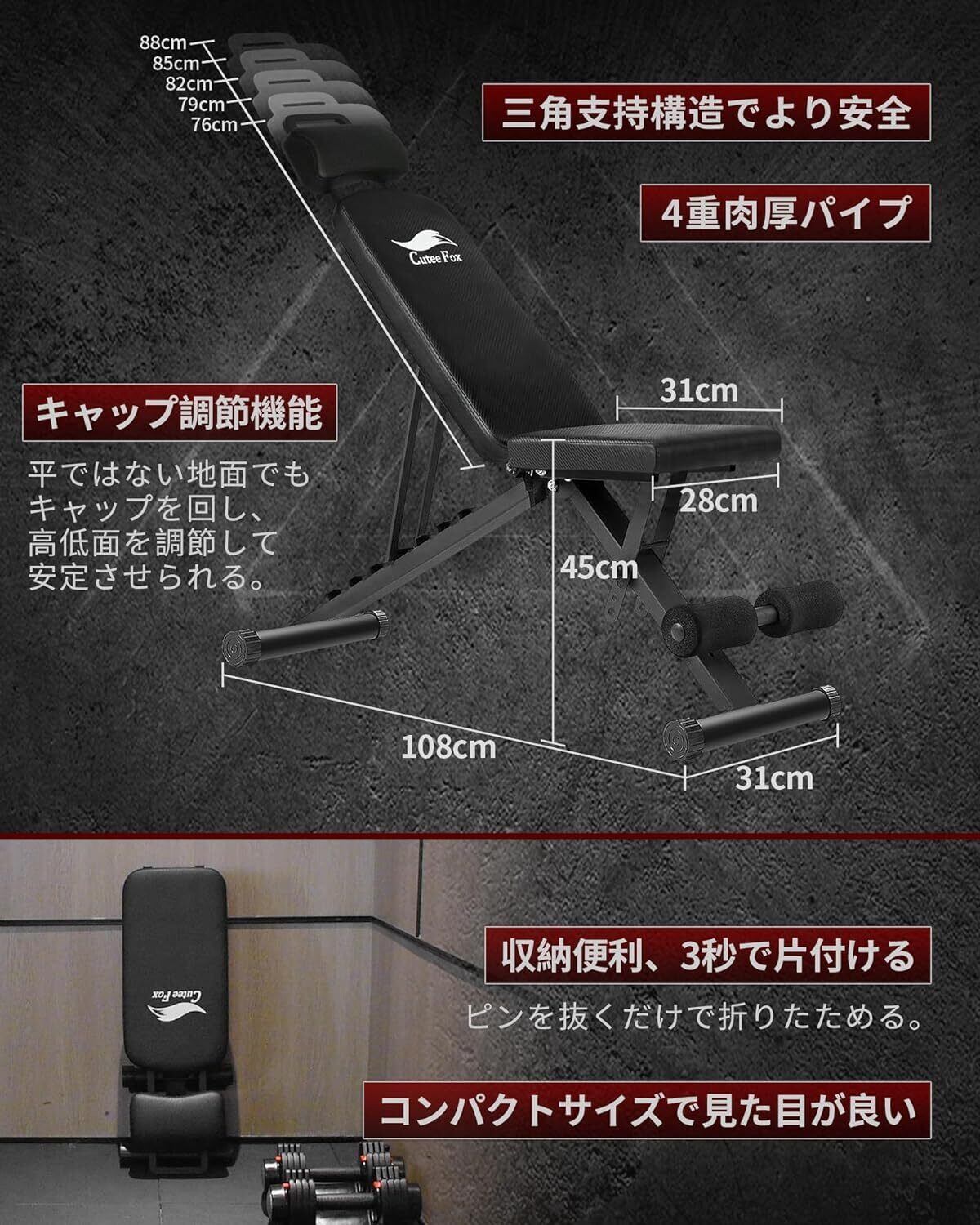 ✅【これ一つで鍛え方いろいろ!】胸:ダンベルフライ、肩:ショルダープレス、腹:デクラインシットアップ、腕:インクラインダンベルカール、背中:ワンハンドローイング、脚:ブルガリアンスクワットなど様々な運動がこれ一つで行えます!自宅でお手軽に全身を鍛えられます。