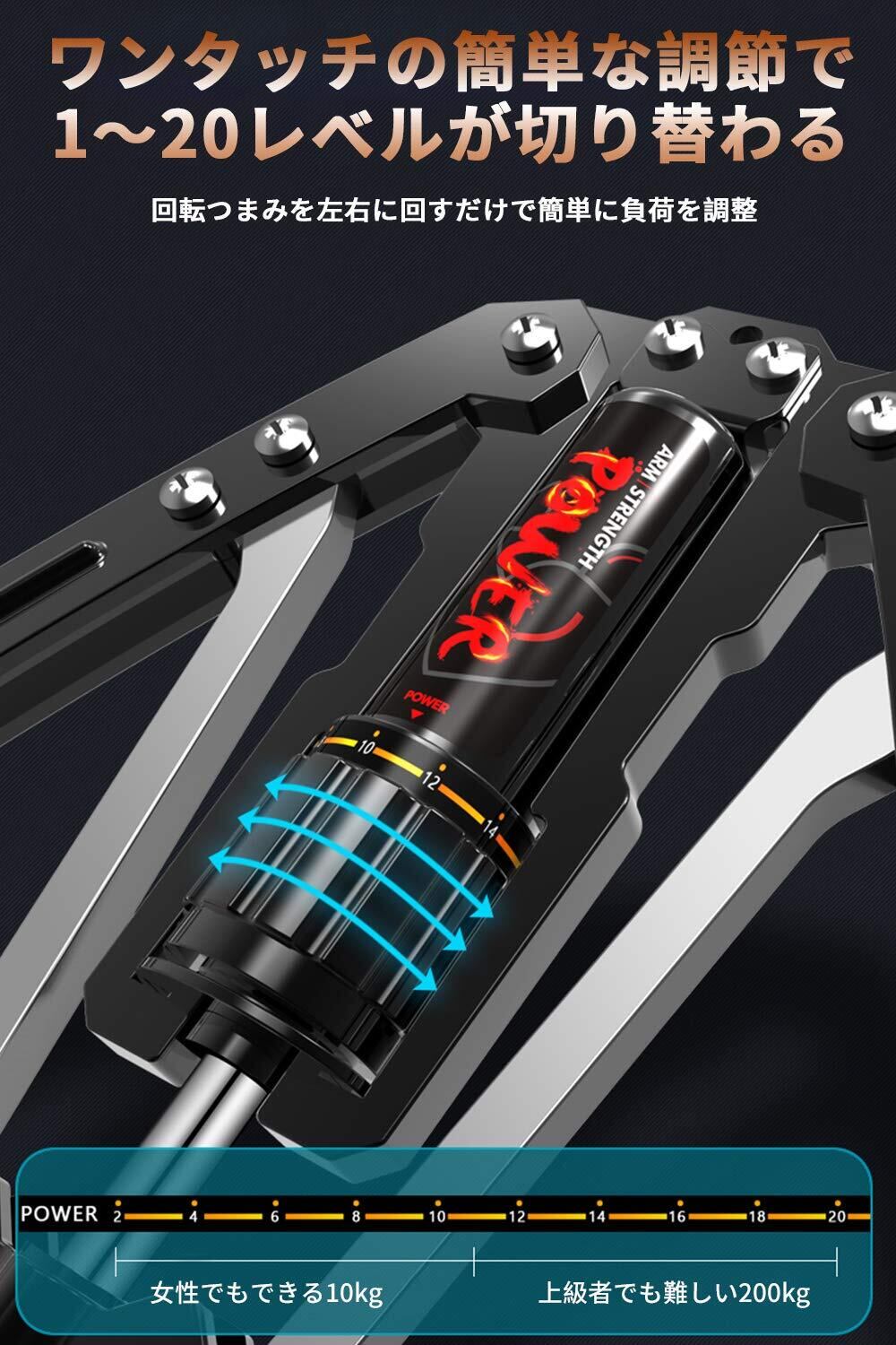 【筋トレグッズの製品仕様】サイズ:全長43cm、幅16cm、重量:2.3kg。素材:本体:カーボンスチール、持ち手:PUソフトラバー。機能:対応負荷:10-200kg、ワンタッチ無段階調整、挟み込み防止安全構造、滑り止めグリップ、ストッパー付き。※使用前の注意:1、負荷調整ができない場合は、ダイヤルを軽くたたいてください。 2、使用前にネジが緩んでいないか確認してください。緩みがある場合は、固定してから使用してください。安心保証付きのため、もし不備があった際は遠慮なくご連絡をお願いいたします。