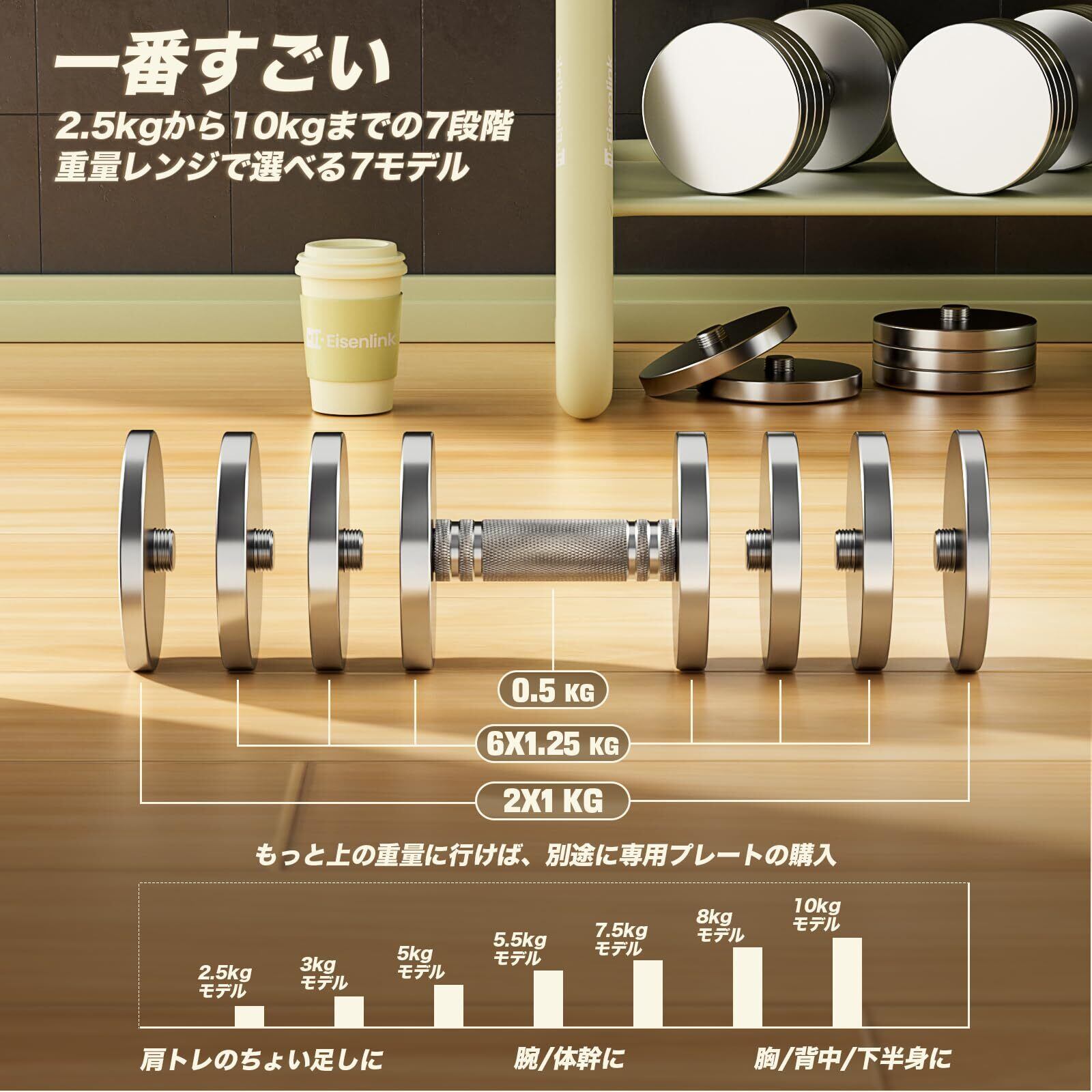 Eisenlink ダンベル 可変式 スチール製 2.5kg 3kg 5kg 5.5kg 7.5kg 8kg 10kg クロームメッキ ホームジム用 サンドブラスト版-銀色 10kg×2個+バーセット