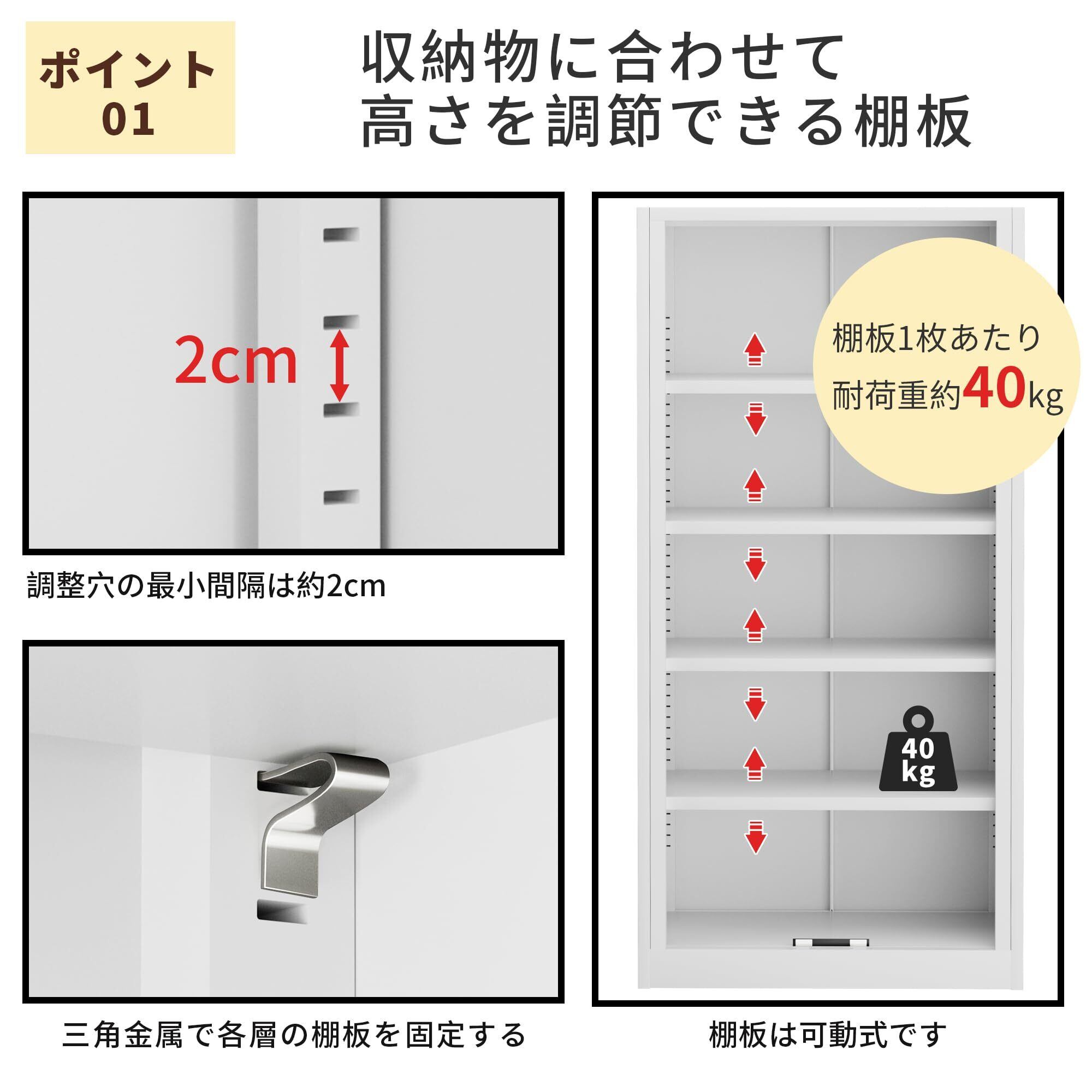 「可動棚板&盗難防止」ハーフタイプと上下可動な棚板は、空間をより活用し、必要に応じて各棚板の間隔を自由に設定できます。大切な書類をしっかり片付き、コピー用紙などの重いものが収納可能です。付属の錠と鍵があれば盗難の心配もありません。私物を一時的に保管する収納ケースとしても最適です。