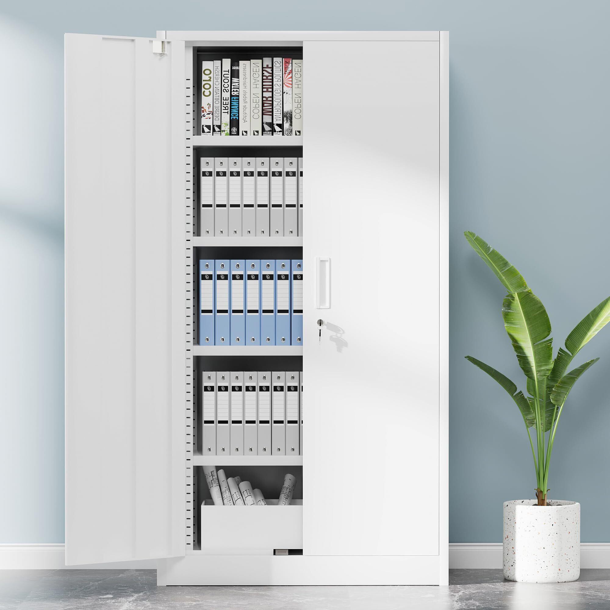 Alebert スチールロッカー 書庫 5段 高さ170*幅76cm 鍵付きキャビネット スチールキャビネット スチール書庫 書類保管庫 傷・汚れに強い 両開き 棚板可動 ベース付き ハーフタイプ 組立品 法人、個人事業主様向け ホワイト