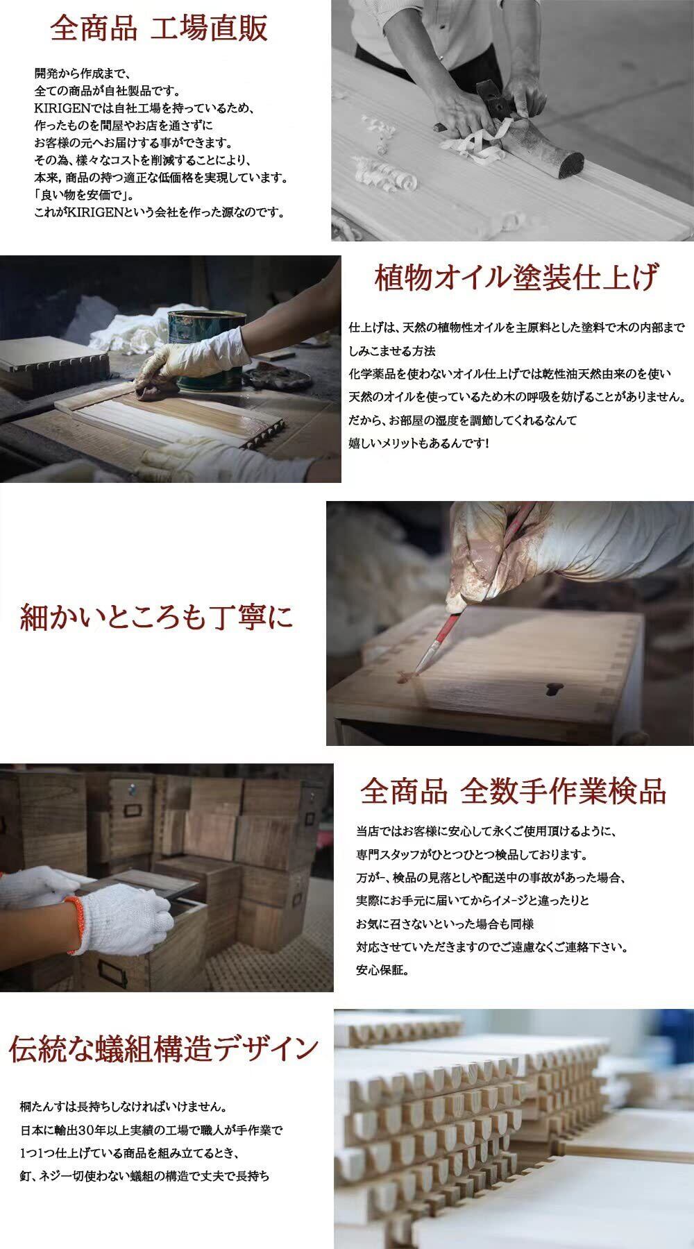 ★特徴2:【天然木製、丈夫で長持ち】引出も本体も蟻組仕様構造、棚板も12㎜厚み天然木桐材使用、丈夫で長持ち収納ボックス。仕様:レターケースの裏板と引出の底板は桐化粧板、他は天然木桐材