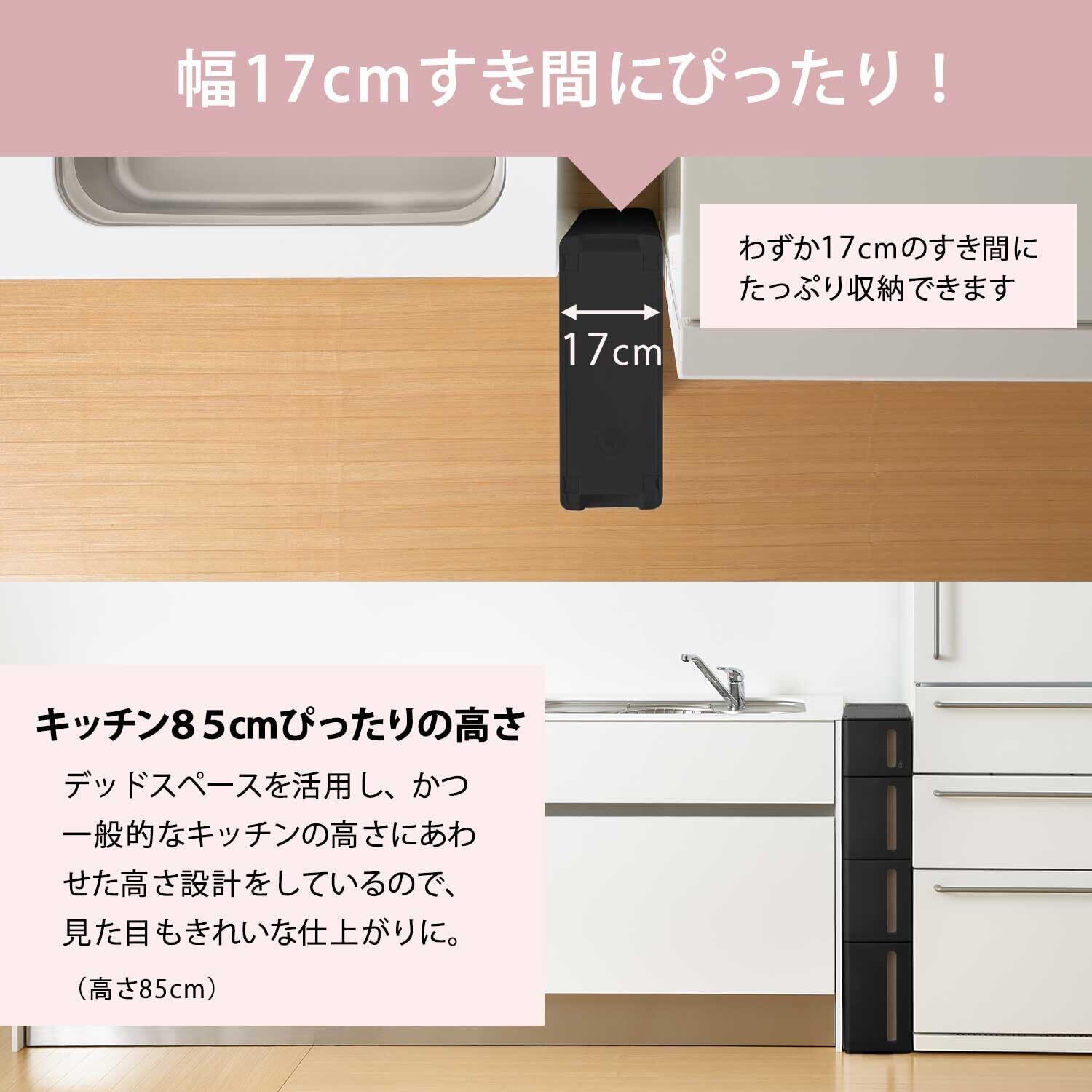 サンカ ストランティ キャスター付き 隙間収納 17cm 引き出し 4段 ブラック すぐに使える完成品 一般的なキッチンと同じ高さ(85cm) 重ねて使えるロック機構 引き出し落下防止ストッパー 付き 日本製 キッチンラック ランドリーラック 冷蔵庫 トイレ ドロアーC DC-2101BK