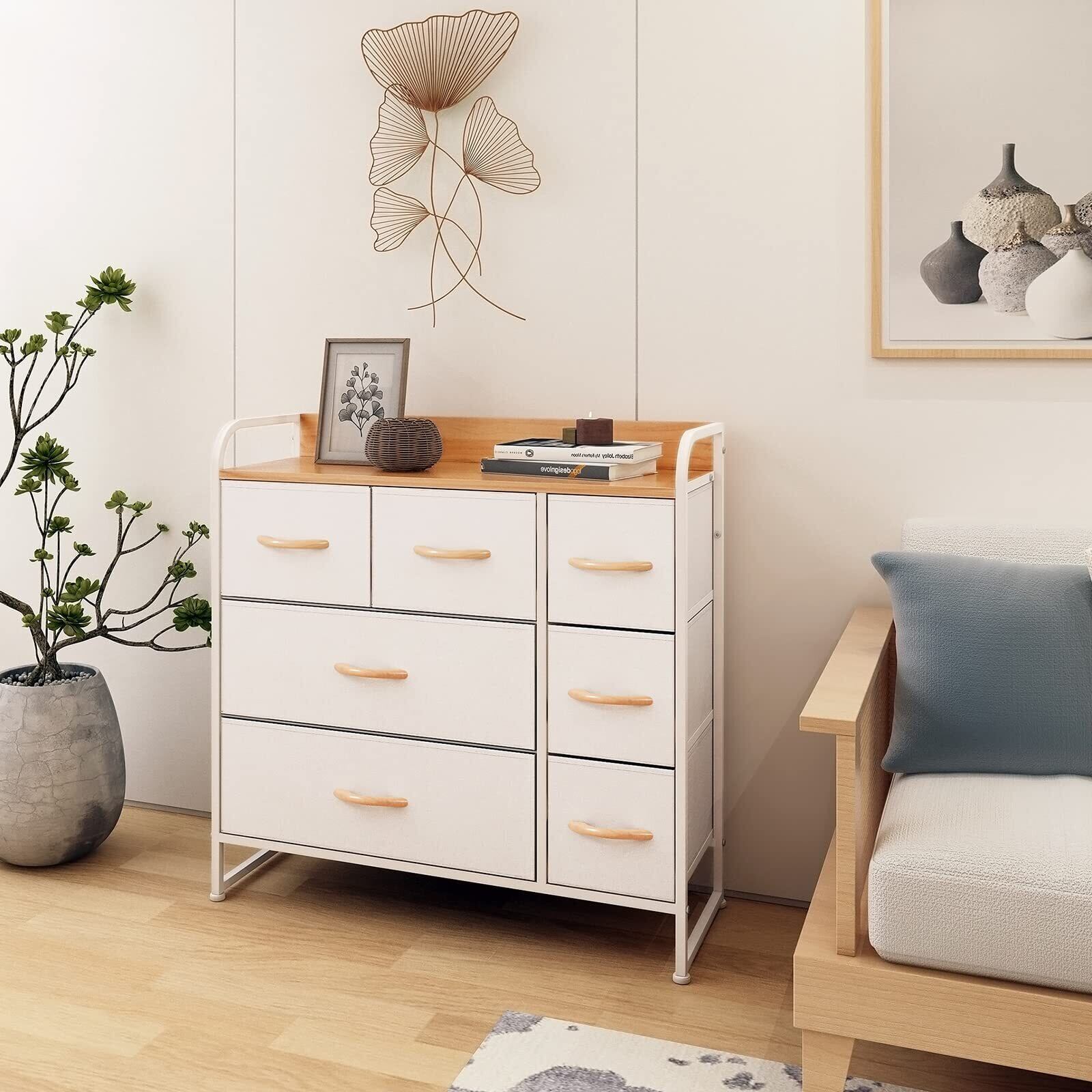 LYNCOHOME 収納 チェスト タンス 合金鋼 ベージュ 布製 引き出し 衣類収納 リビング収納 転倒防止 低ホルム 3段7杯【幅80×奥行29×高さ79cm】