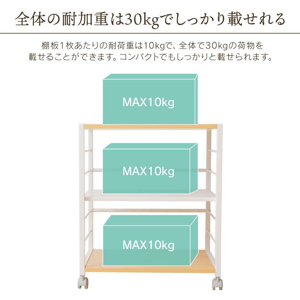 耐荷重/商品全体:30kg、天板・棚板(下)・可動棚:各10kg、キャスター:15kg/個