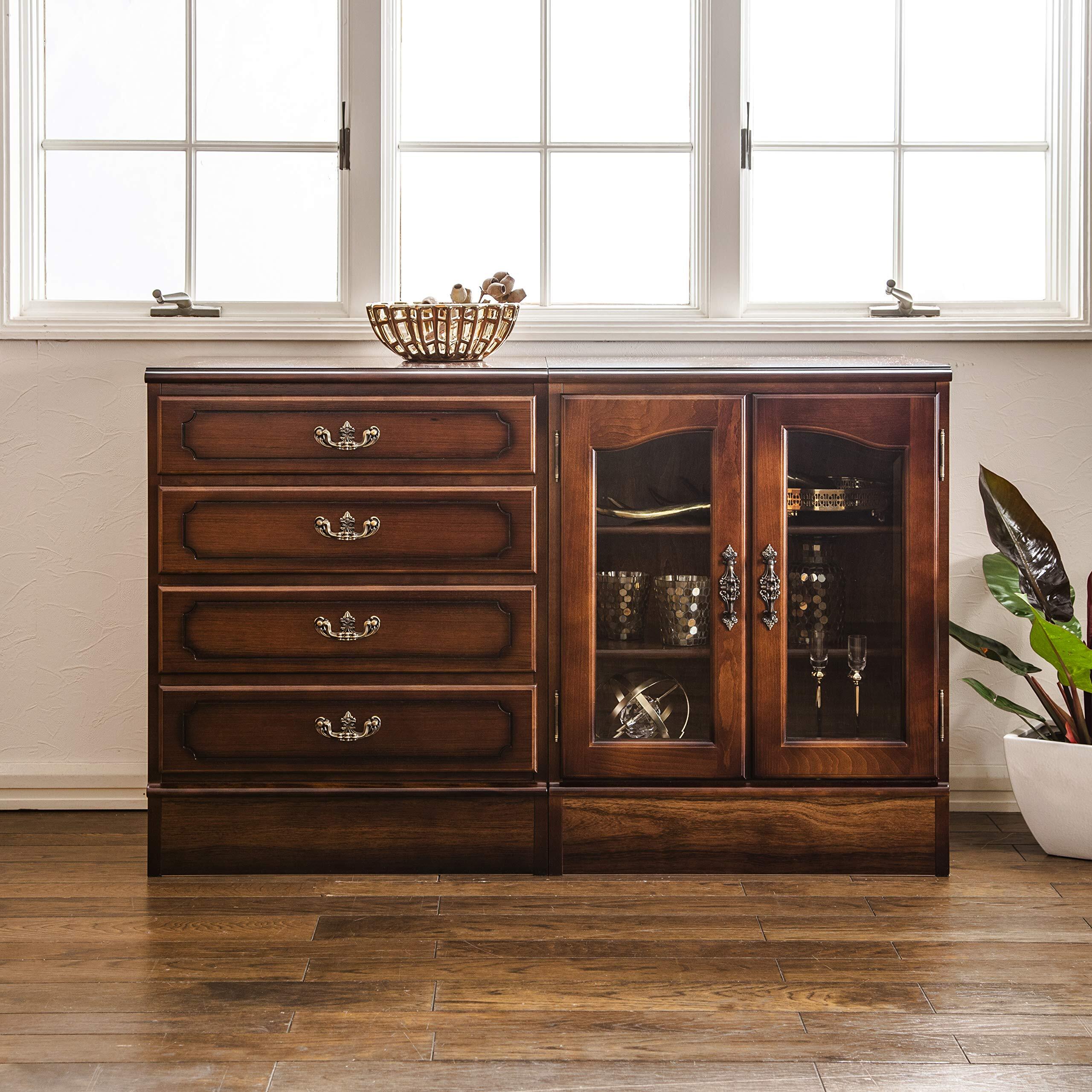 カントリースタイルのオシャレでコンパクトなキャビネット。引出や扉の取手デザインや塗装仕上げにこだわっています。ガラス扉で見せる収納・飾る収納を楽しんでいただけます。
