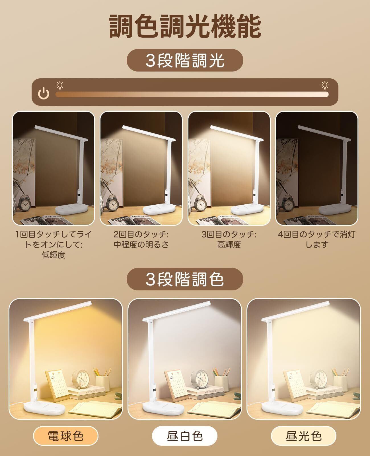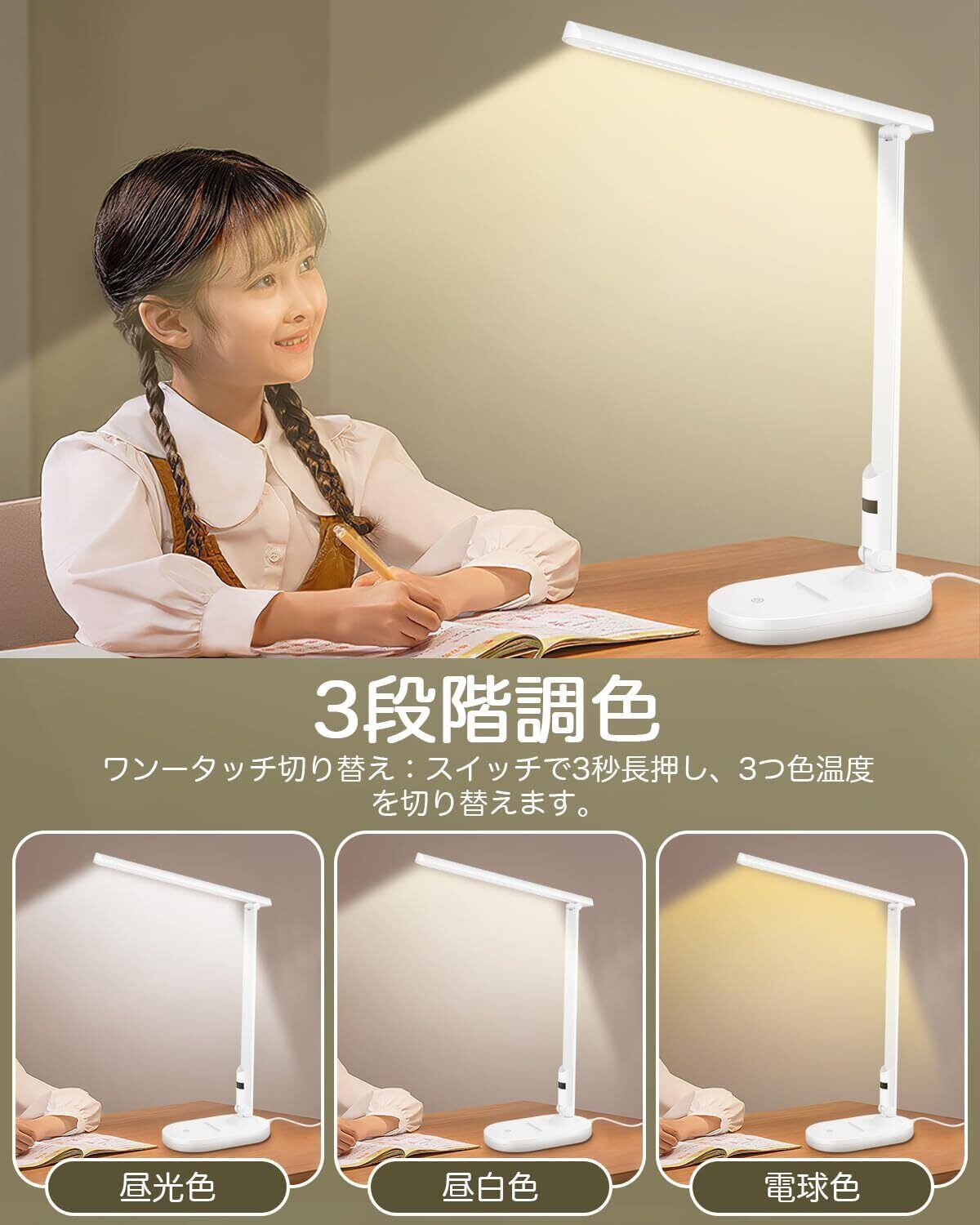【超高輝度・調色調光機能】このデスクライトは他の製品より明るくて、多重陰影や点滅を防ぐ、子供や大人の目を守ります。作業や勉強などに最適です!電球色・昼白色・昼光色の3段階調色機能が搭載され、使用シーンに合わせて軽くタッチするだけでお好みの色温度と明るさが調整できます。