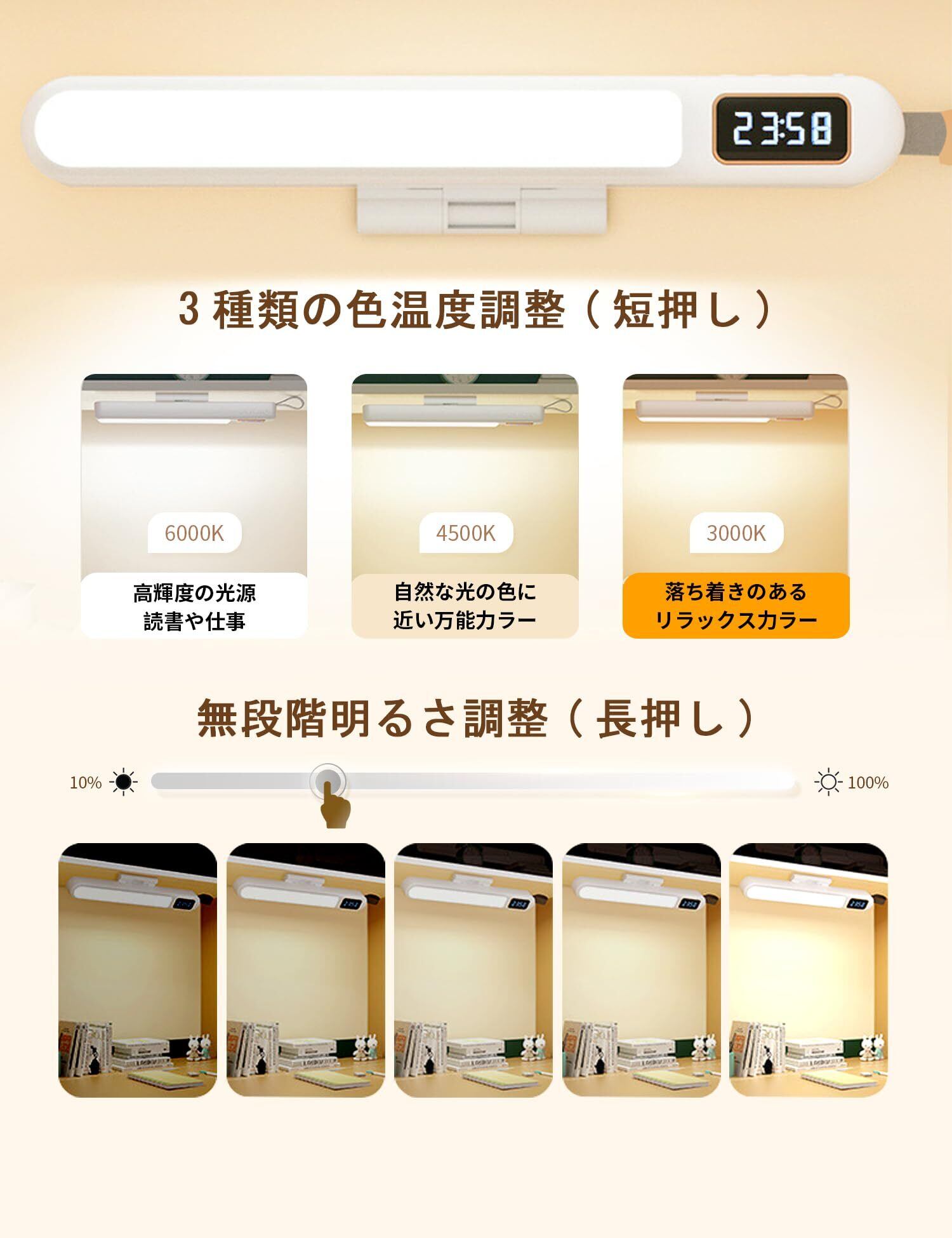 【120°調整可能・タイミング機能・デジタル液晶時計】おしゃれの台座に付けて120°回して、好みの角度にはできます。他のLEDライトとは違って、この革新的な設計は光源を120°の間に回転させることができます。タイミング機能付きので、 10分間、30分間を設定可能です。勉強や読書中にうっかり寝てしまっても自動的にオフになるので、電量を節約できます。液晶部には時間が分かりやすく表示されており。ナイトライトとしても大歓迎です。