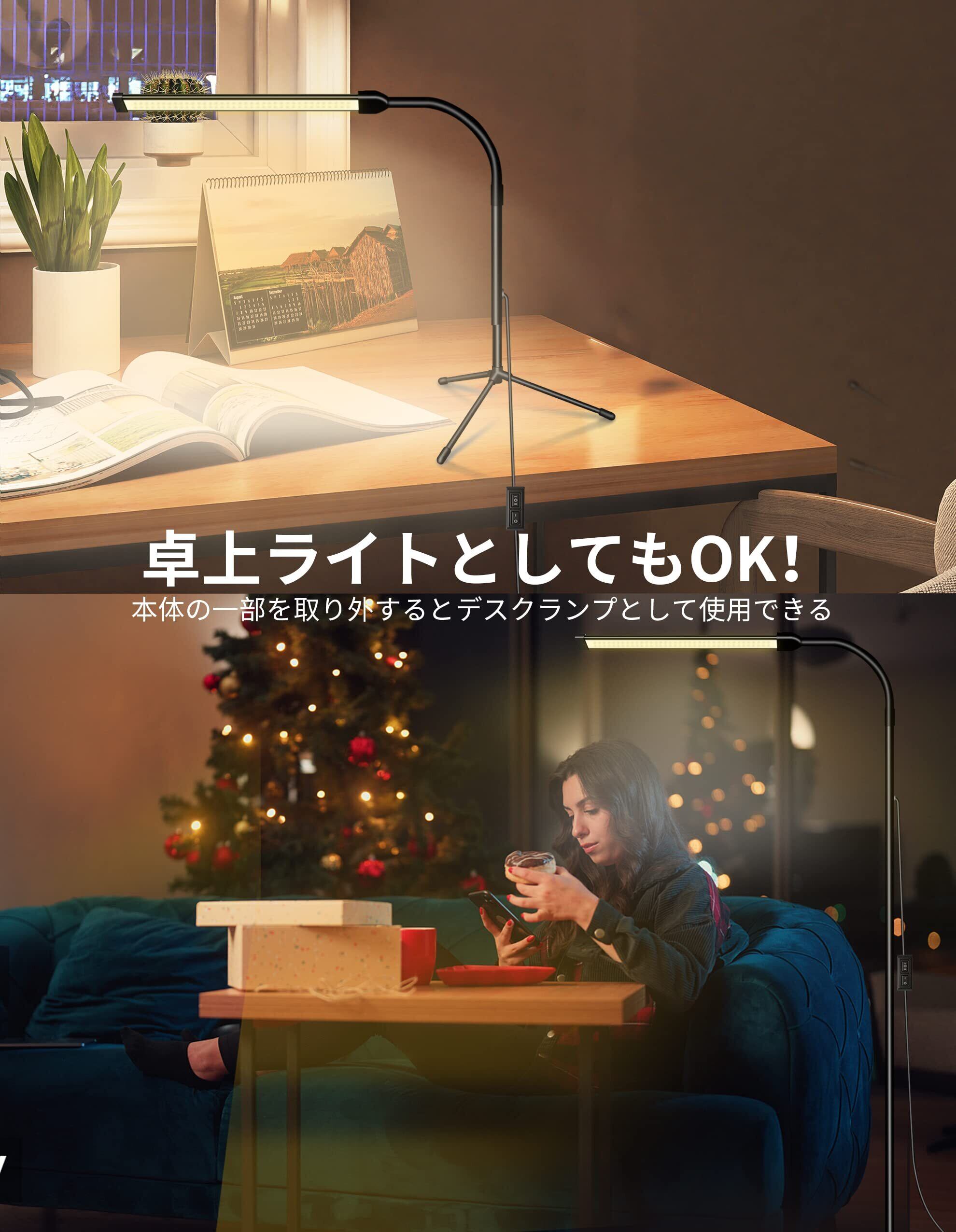 ●【発光色明るさ調整】2段階調色(昼白色&昼光色)と2段階調光を調節できます。お好みの色を選べるようになっております。ライトの明るさと光色を用途に合わせて調整が可能。また、ワンボタンでフル点灯、常夜灯に簡単切り替えがとても便利です。 ●【1灯2役】フロアライトのミドルポールを1個外せばデスクライトになります。