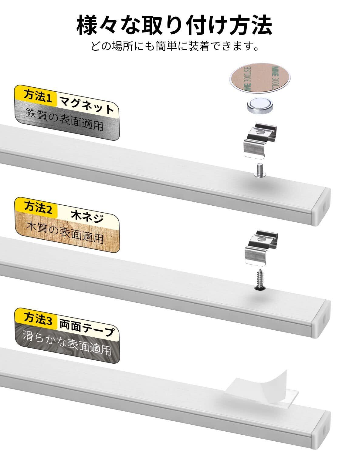 【磁石&両面テープが付き】電気工事が不要で、簡単に取り付けられます。ケーブルクリップも入り、ケーブルの整理に活用できます。キャビネット、ベッド、寝室、地下室、ガレージ、キャビネット、本棚、戸棚、倉庫、部屋照明などいろんな場所でご利用頂けます。