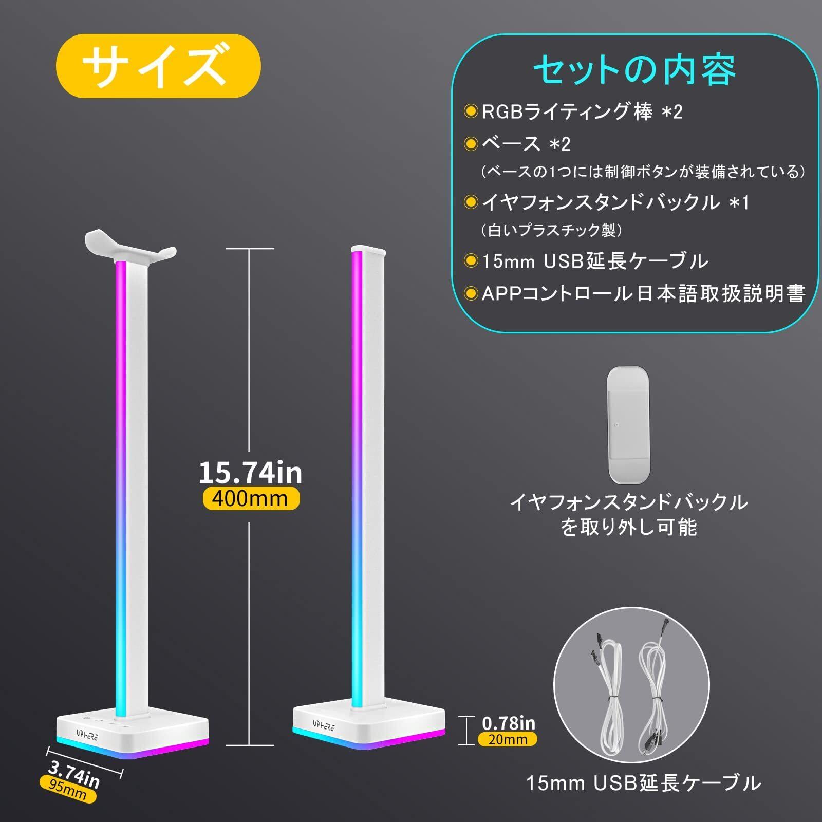 【多機能】●双方向取り付け:RGBライティング棒を正面または背面に取り付けて、必要な雰囲気効果を作成できます。●タイミング機能により、事前に設定可能。●取り外し可能なヘッドセットスタンドバックル機能: トップカバーを簡単に交換し、ヘッドセットを手が届きやすいに掛ける可能。PCゲーミングヘッドセットや有線ヘッドセットなど、様々なタイプのヘッドセットを収納可能。デスクトップをより楽にする。●PC 5V 2A USB給電式で、プラグアンドプレイです。