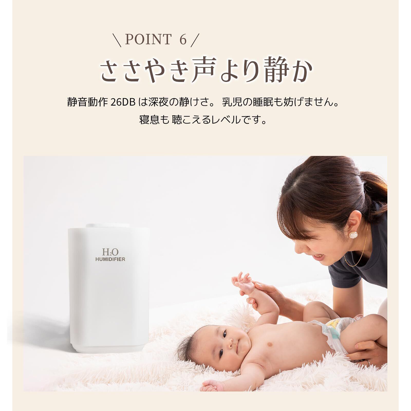 【超静音設計 & アロマ対応 & 簡単お手入れ】:運転音約25?の静音設計。就寝中に気づかれにくく、しっかり加湿できます。運転音が静かなので、寝室や書斎などでの使用に適しています。アロマ対応なので、お好みの水溶性アロマオイルが使えます。加湿しながら寝室を好きな香りで満たすことができます。 上部の給水口は簡単に取り外せるので、いつも清潔に保てます。