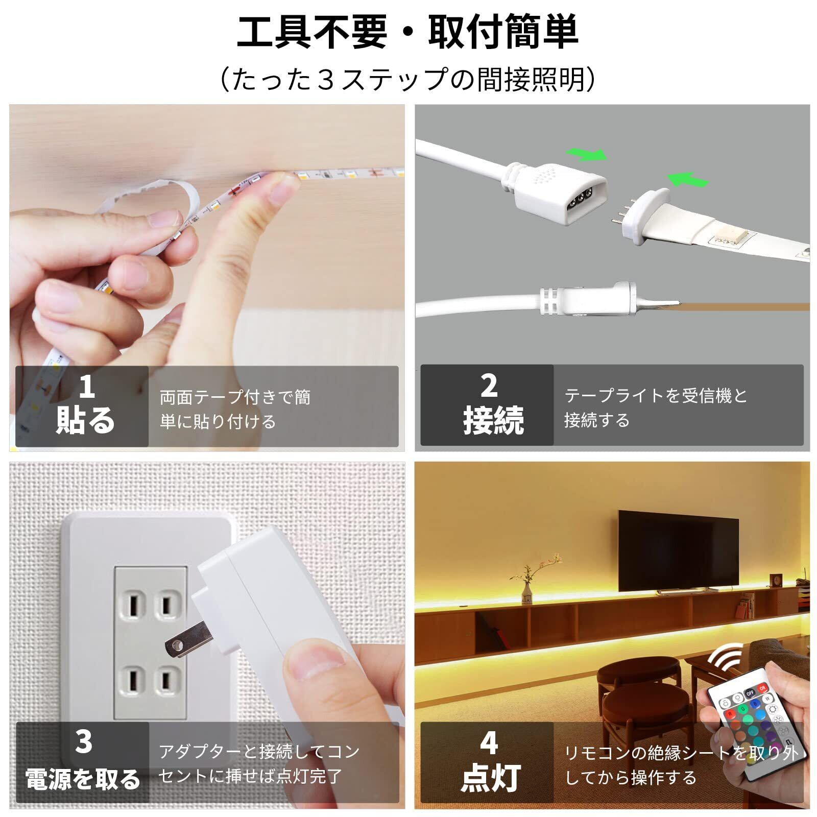 【ledテープ・間接照明】ledテープを剥がして貼るだけ簡単に取り付けます。剥がしても痕がつかない、賃貸の方にもおススメ!壁を照らす、天井を照らす、テレビの背面、棚、玄関、床を照らすなど使い方は様々です。