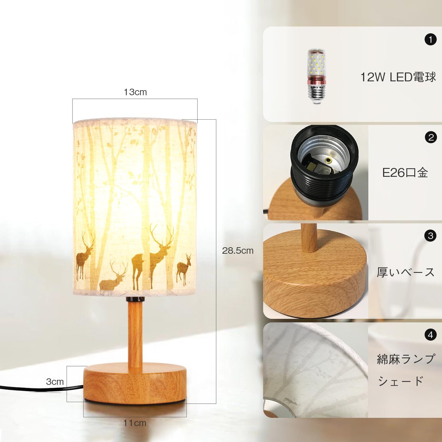 Ledoversea テーブルランプ 和風ベッドサイド 3段階調色 昼光色 電球色 昼白色 間接照明 スイッチつき 配線コードつき 布地 チラつきなし 目に優しい 鹿柄 PSE認証済