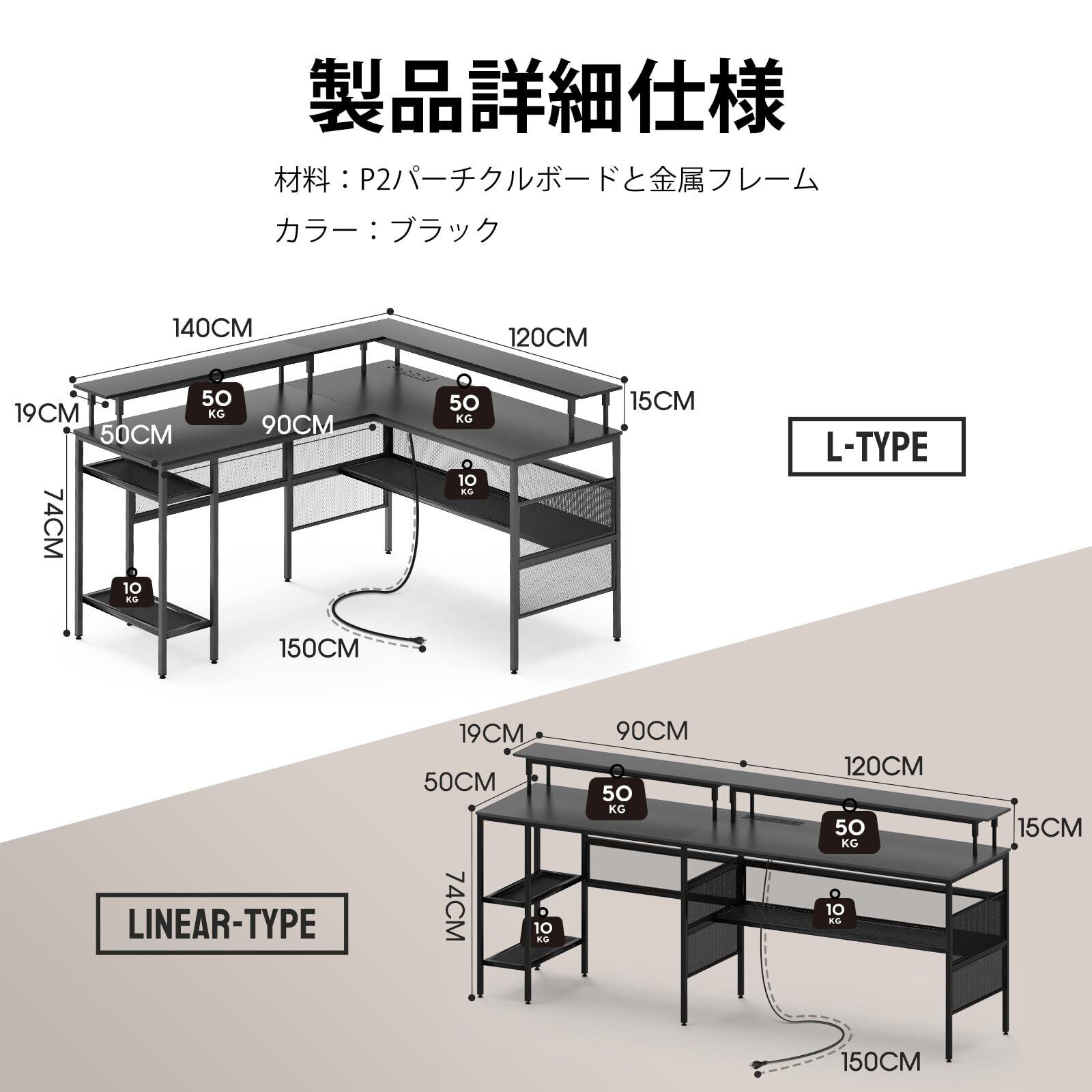 このL字型ゲーミングデスクには2つの電源ソケットと1つのUSB充電ポートがあり