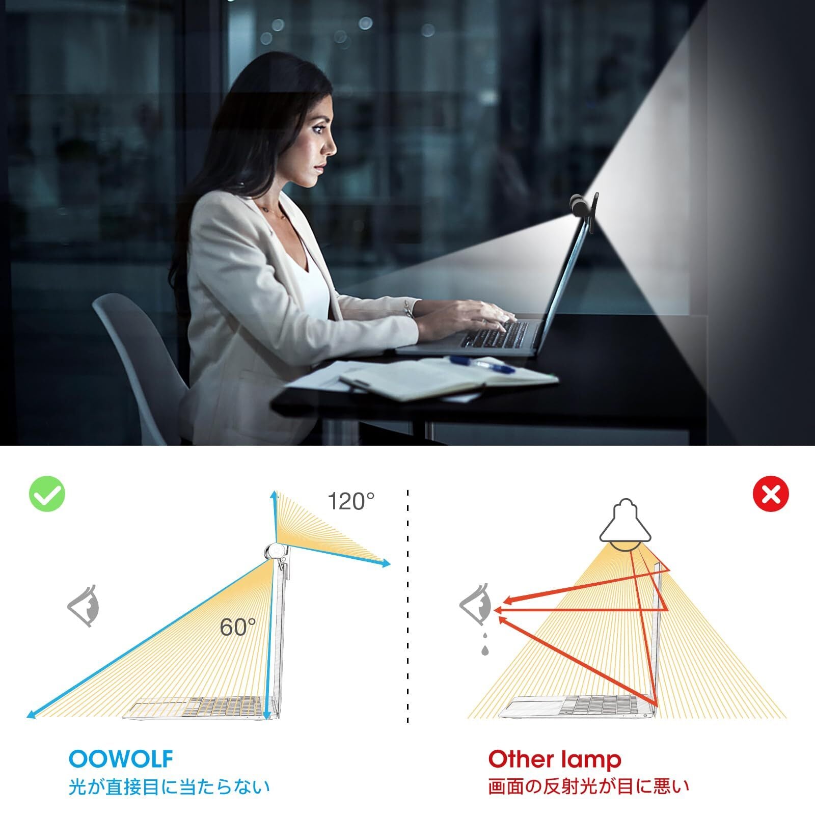 非対称配光で直接目に当たらずに眼精疲労から目を守ってくれる効果も期待できます